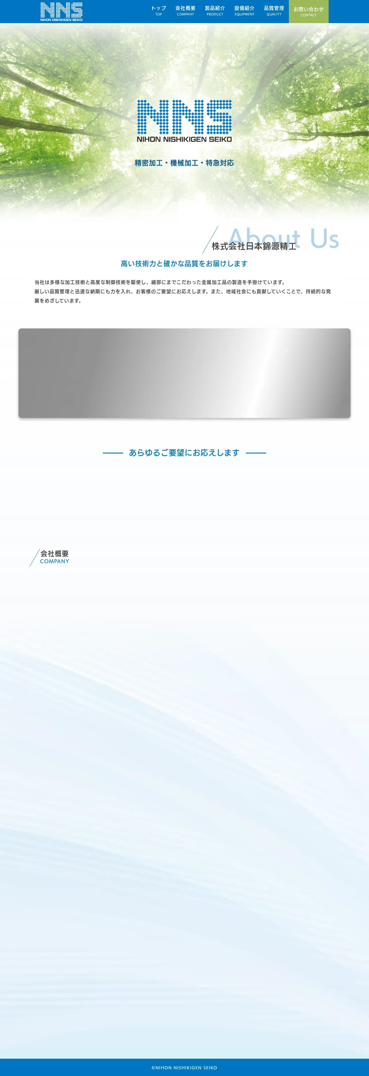 Nihon Nishikigen Seiko Co., Ltd. produces precision metal components using diverse machining methods and advanced control technologies. The company emphasizes strict quality control, attention to detail and fast delivery, including rush orders for complex parts. It also operates a manufacturing facility in Dongguan, Guangdong (Dongguan Jinyuan Hardware Co., Ltd.) and seeks sustainable development through regional contribution.