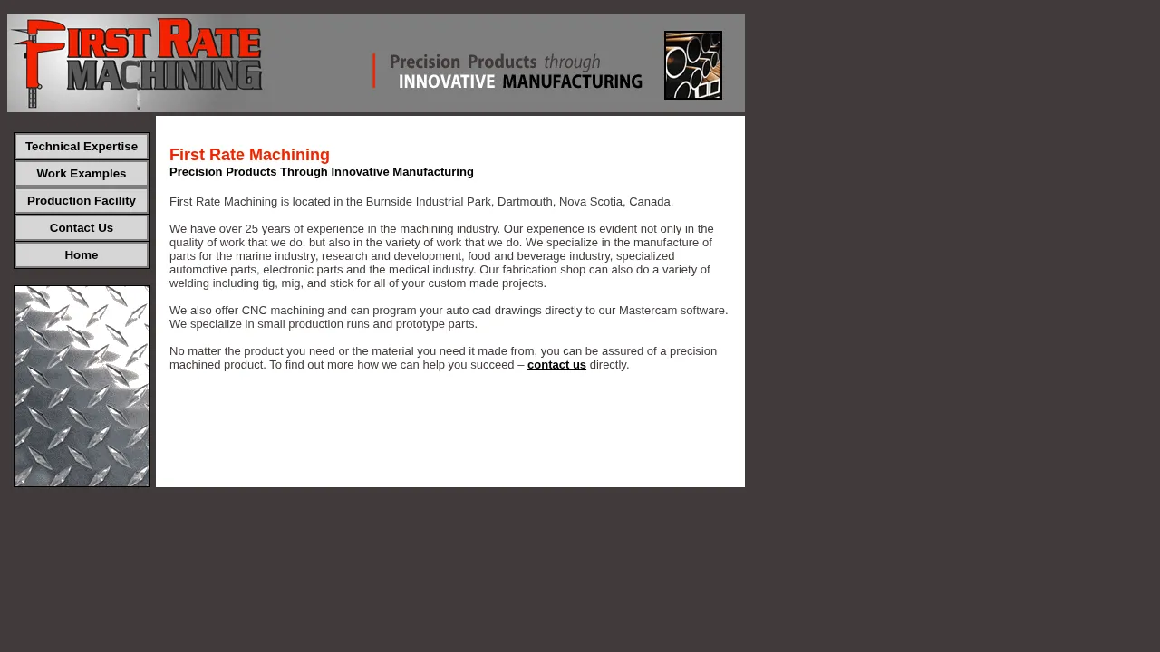First Rate Machining is a machining company based in the Burnside/Dartmouth area of Nova Scotia. The company provides technical machining services for production work and prototypes from its local production facility. Services emphasize precision and manufacturing support for industrial clients.