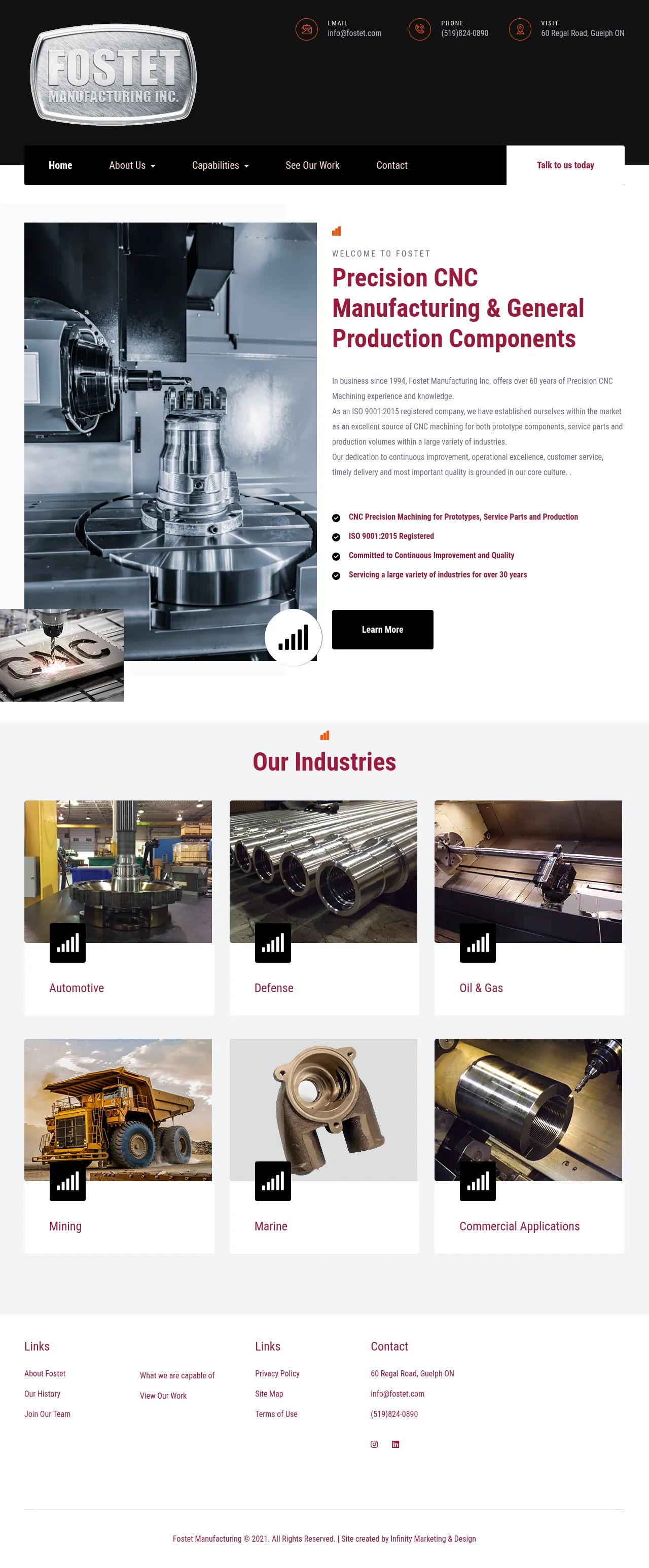 Fostet Manufacturing Inc. is a precision CNC machining company based in Guelph, Ontario, with over three decades of industry experience. Established in 1994, the company specializes in producing prototype components, service parts, and production-volume runs for various sectors. Their service portfolio supports clients across the automotive, defense, mining, marine, and commercial industries. The organization emphasizes operational excellence, consistent quality control, and timely delivery to meet complex engineering requirements. As an ISO 9001:2015 registered business, Fostet Manufacturing maintains a core focus on continuous improvement and customer-centric service standards.