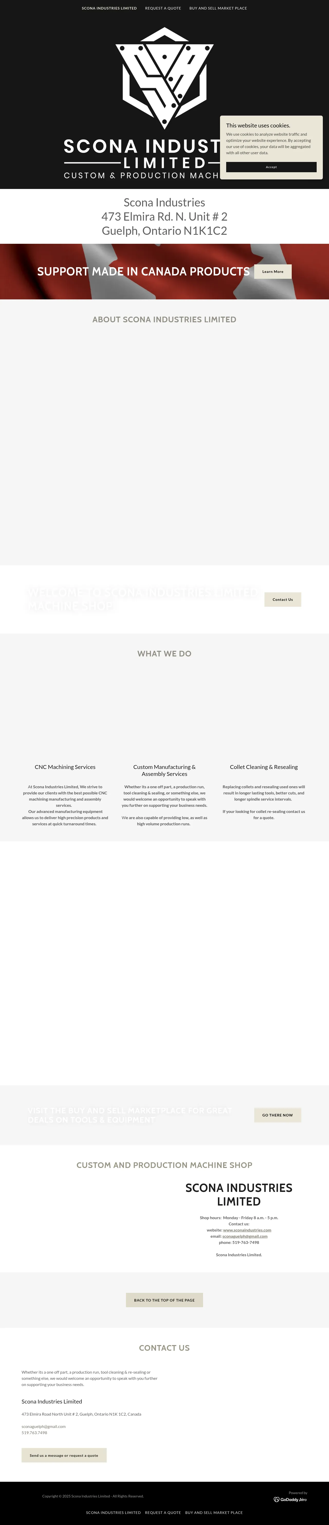 Scona Industries Limited is a precision machine shop located in Guelph, Ontario, specializing in both custom and production machining services. The company provides specialized technical support, including collet re-sealing, and offers a comprehensive marketplace for buying and selling industrial tools and equipment. They maintain an active inventory of various machining supplies, including cutters, inserts, and endmills to support client manufacturing needs. Scona Industries operates as a versatile partner for industrial clients requiring reliable machining solutions and access to high-quality manufacturing hardware.
