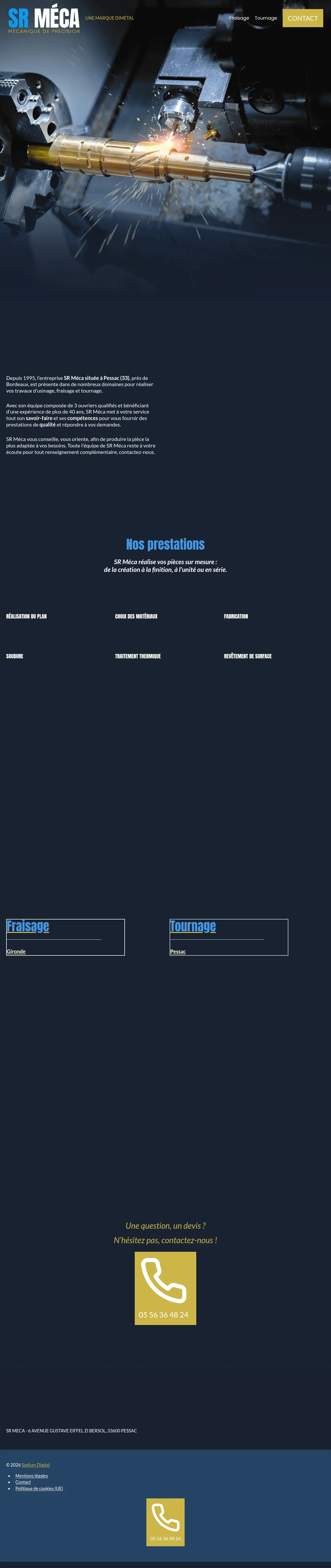 SR Meca is a precision machining company based in Pessac, France, with over 40 years of experience in the industry. The firm specializes in the end-to-end production of custom mechanical components, managing projects from initial design and material selection through to final fabrication and finishing. Their capabilities include milling, turning, welding, heat treatment, and surface coating. Operating with a team of skilled professionals, the company provides both one-off prototypes and volume production series to meet client requirements. SR Meca emphasizes a consultative approach, assisting clients in technical design and material optimization to ensure functional and cost-effective solutions.