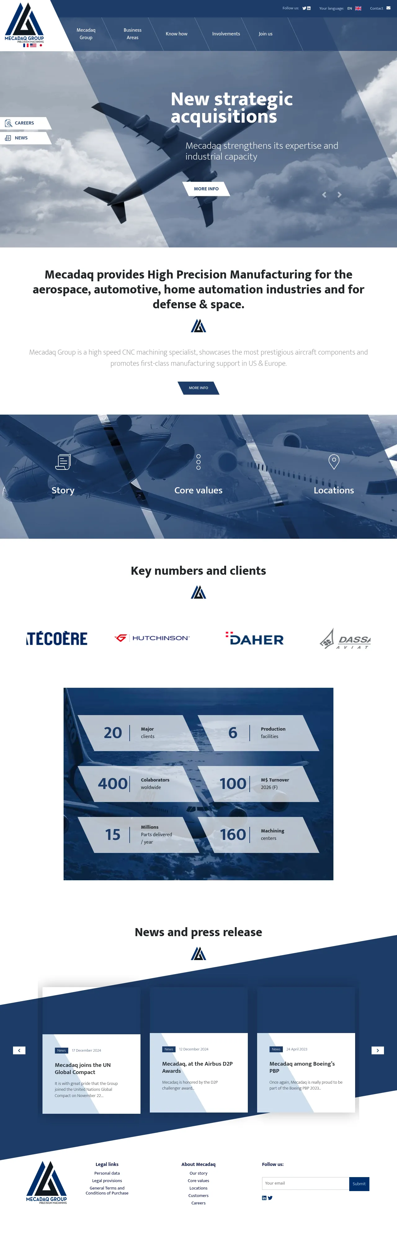 Mecadaq is a global precision engineering group with over 50 years of experience in the manufacturing sector. The company specializes in the industrialization and production of high-precision components, primarily serving the aerospace and defense industries. Their comprehensive service offering includes end-to-end production management, ranging from advanced machining to final quality control. Operating across multiple international facilities, Mecadaq maintains a commitment to rigorous industrial standards and consistent delivery performance for major global clients. The group distinguishes itself through sustained strategic growth, consistent recognition by aerospace OEMs, and a focus on sustainable manufacturing practices.