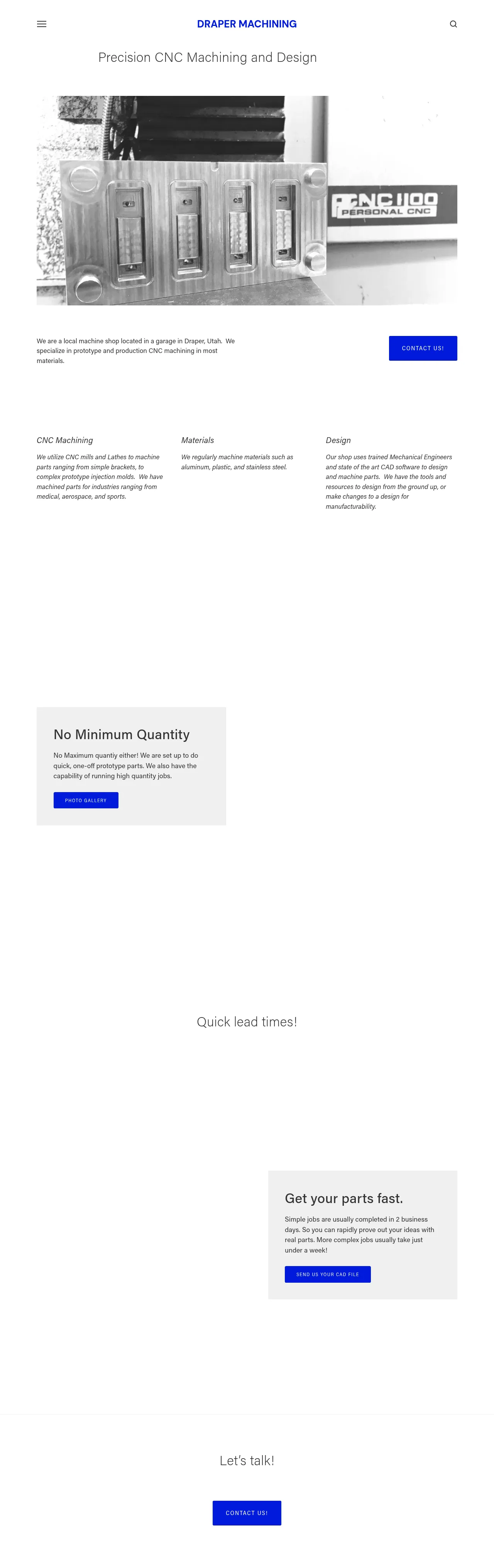 Draper Machining is a precision CNC machine shop based in Utah that provides custom manufacturing and design services. The company specializes in the production of prototype parts and components for clients in the medical, aerospace, and sports industries. Utilizing CNC milling and turning technology, they support projects ranging from simple bracket fabrication to the development of complex injection molds. Their team consists of mechanical engineers who assist with design for manufacturability and custom engineering needs. Draper Machining distinguishes itself through rapid turnaround times, with most simple projects completed within two business days and no minimum quantity requirements for production runs.