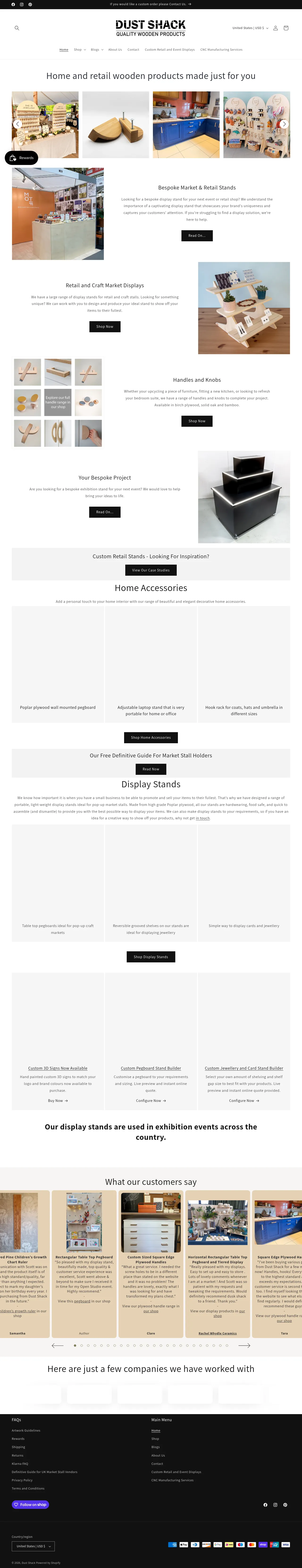 Dust Shack is a North Wales-based design and manufacturing studio specializing in bespoke wooden furniture, retail display solutions, and home accessories. The company integrates traditional woodworking craftsmanship with advanced digital design and CNC machining services to produce custom projects for homes and businesses. Their expertise spans a wide range of products including modular display stands, plywood cabinetry, door hardware, and decorative signage. Dust Shack emphasizes sustainable practices by using responsibly sourced, PEFC and FSC-certified timber and non-toxic finishes. They provide full support from initial 3D design and consultation to final production, catering to both individual residential needs and commercial trade show requirements.