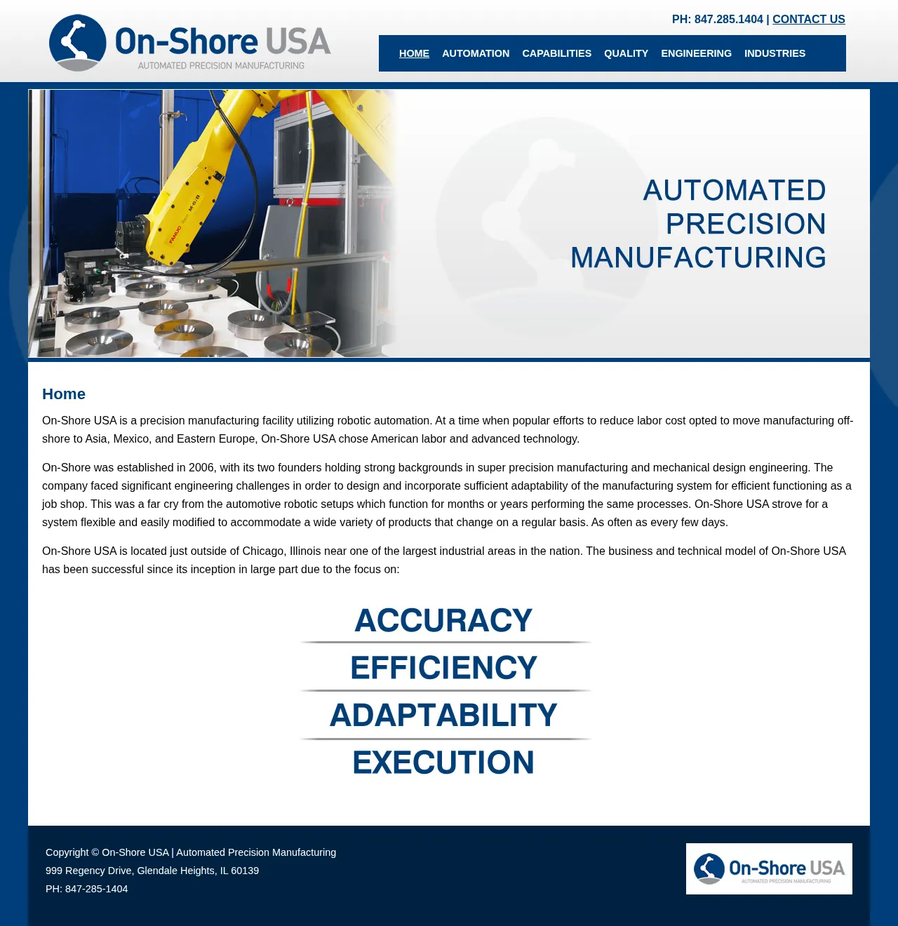 On-Shore USA is a precision manufacturing facility located near Chicago, Illinois, specializing in automated production processes. Since 2006, the company has leveraged robotic automation and in-house engineering to manufacture high-precision components for sectors including aerospace, defense, rail, and telecommunications. Their expertise spans complex machining and mechanical design, providing flexible manufacturing solutions that adapt to diverse product requirements. By integrating robotic systems with specialized workholding, the firm maintains high quality standards and efficient production turnaround. The company emphasizes advanced technical support and proactive quality systems tailored to evolving industry needs.