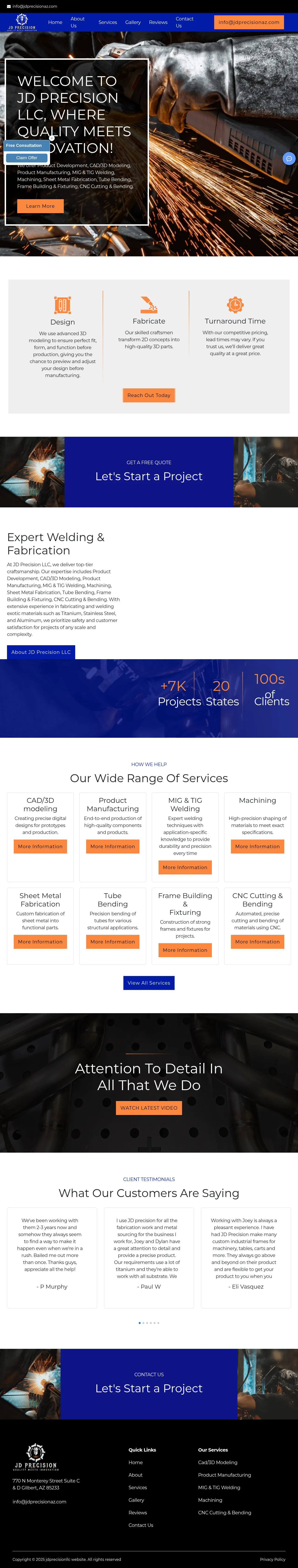 JD Precision LLC is an industrial fabrication and manufacturing firm specializing in custom metalwork and precision engineering. The company provides end-to-end services ranging from 3D design and modeling to final product assembly. Their core capabilities include MIG and TIG welding, sheet metal fabrication, tube bending, and CNC machining for a variety of industrial applications. Known for their rapid turnaround and attention to detail, they serve a diverse client base across numerous states. The firm emphasizes quality craftsmanship and is equipped to handle complex projects involving various metallic substrates.