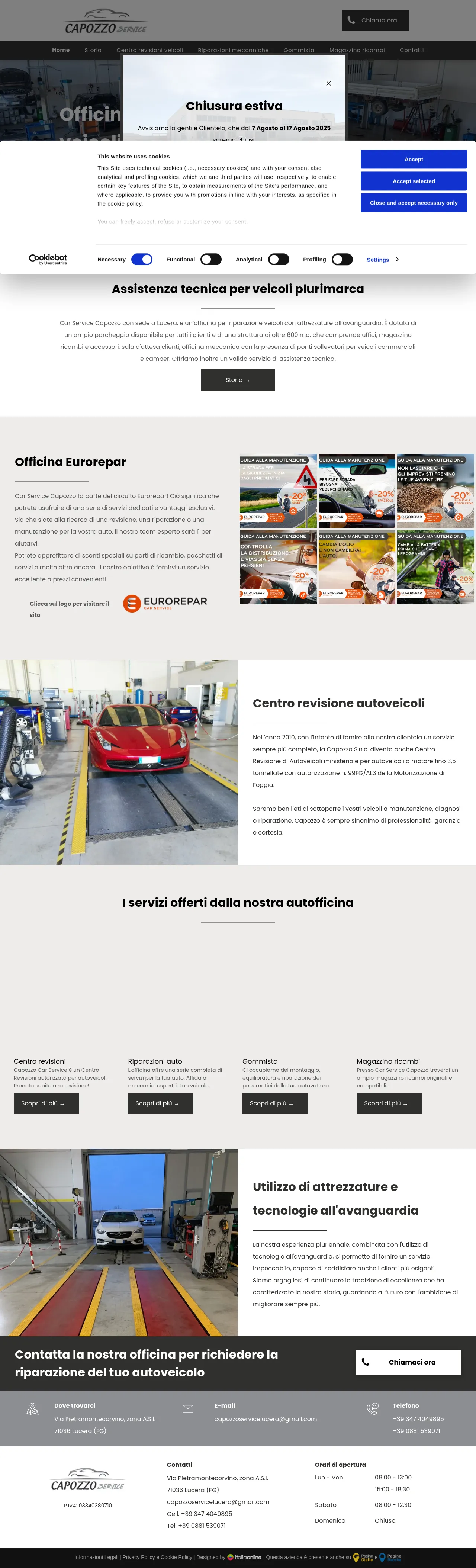 Car Service Capozzo is an established automotive repair facility based in Lucera, Italy, operating since 1956. The company provides a comprehensive range of mechanical maintenance, diagnostics, and repair services for all vehicle makes, including light commercial vehicles and campers. As an authorized Ministry of Transport inspection center, they specialize in mandatory vehicle safety testing and routine maintenance. Their 600-square-meter facility is equipped with modern diagnostic technologies and vehicle lifts to ensure high-quality service. The workshop is a member of the Eurorepar service network, offering customers reliable parts and professional technical support.