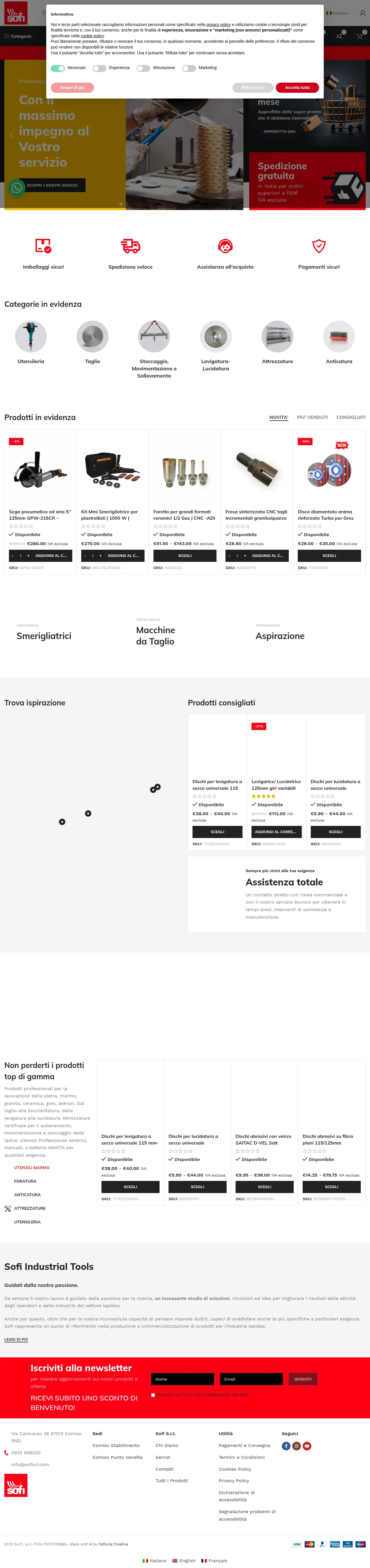 Sofi S.r.l. is a specialized supplier and manufacturer of professional tools and equipment for the stone, marble, and ceramic processing industries. The company offers a wide range of solutions for cutting, grinding, polishing, and drilling, as well as equipment for the handling and storage of stone slabs. They cater to industrial and commercial operators by providing both high-performance power tools and technical assistance. By maintaining a focus on research and development, Sofi delivers tailored solutions for specific surface treatments and material requirements. Their inventory includes comprehensive product lines for construction, maintenance, and metalworking applications.