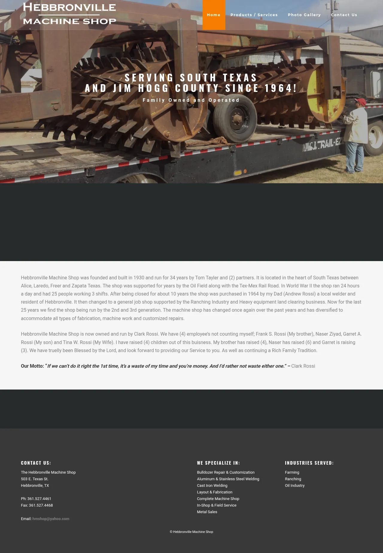 Hebbronville Machine Shop performs custom metal fabrication and repair work for heavy equipment. The company provides fabrication and machining services to restore, modify, or manufacture parts for industrial and agricultural machinery. It focuses on structural repairs, replacement components, and on-site equipment maintenance.