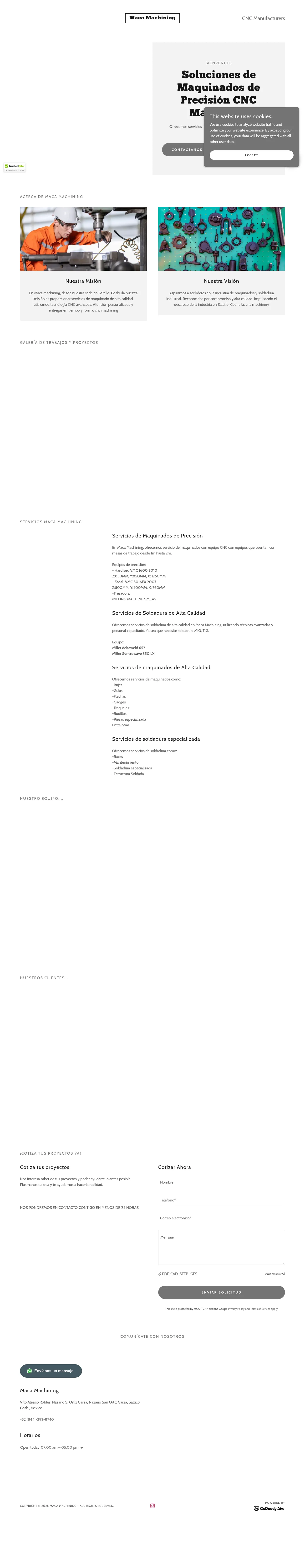 Maca Machining is a Saltillo, Coahuila-based manufacturer specializing in precision CNC machining and industrial welding. The company operates CNC mills with work tables ranging from 1 m to 2 m and provides MIG and TIG welding and specialized welding fabrication. Services cover precision components and fabricated assemblies for both prototype and production needs. Maca Machining emphasizes personalized service and on-time delivery.