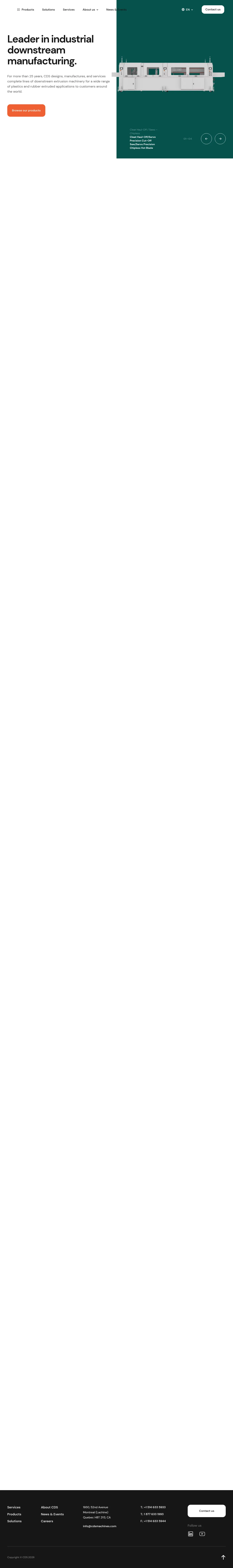 CDS designs, manufactures, and services comprehensive downstream extrusion machinery for the plastics and rubber industries. The company provides custom-engineered turnkey systems, including die tooling, line control, and automation solutions, tailored to high-precision applications. Serving global markets such as automotive, medical, and engineering plastics, CDS focuses on delivering durable, reliable equipment built to client specifications. Beyond manufacturing, the company offers extensive technical support, including machine rebuilds, preventive maintenance, and operator training. Their systems are engineered to manage complex material processing requirements with an emphasis on accuracy, productivity, and safety.
