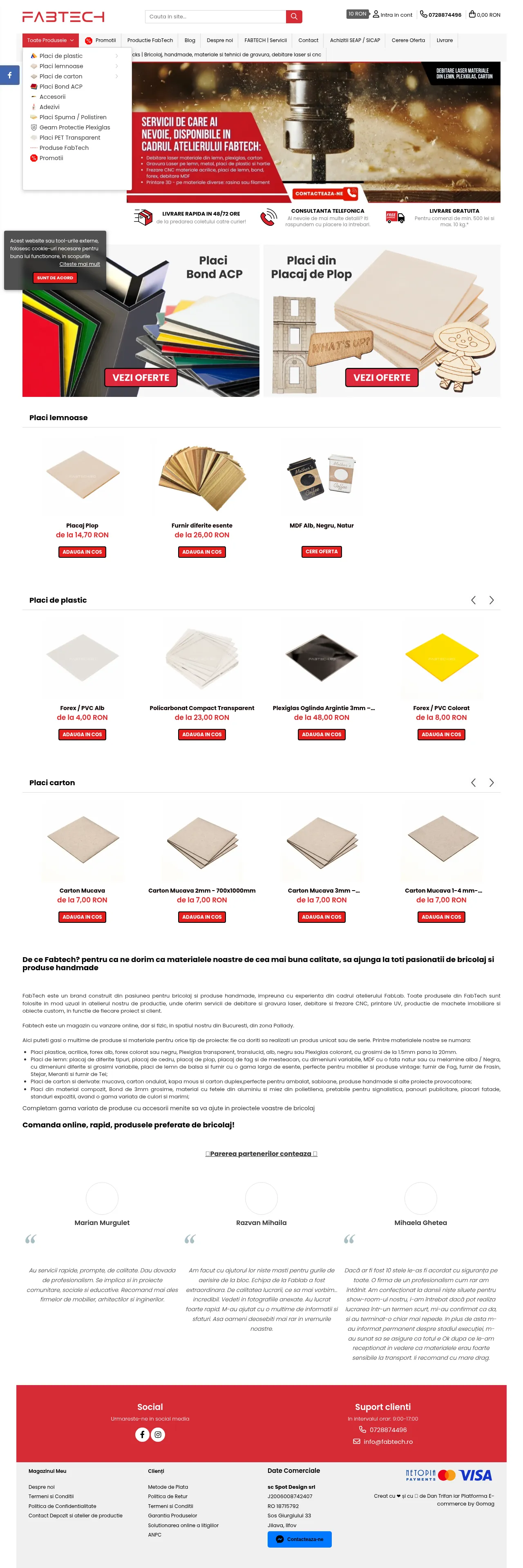 FabTech operates a materials retail shop and a fabrication workshop serving hobbyists and makers. The company sells materials online and from a physical store in the Pallady area of Bucharest and runs a production workshop offering laser cutting and engraving, CNC cutting and milling, UV printing, 3D printing, architectural model production and custom fabrication. FabTech supplies a wide range of plastics, wood-based panels, cardboard products and composite panels for one-off and small-series projects.