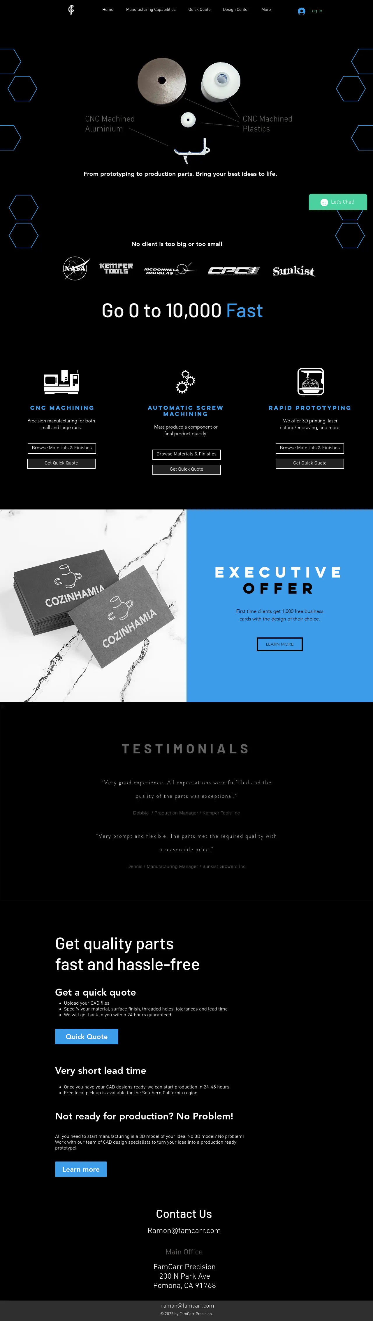 FamCarr Precision is a manufacturing services provider specializing in CNC machining and rapid prototyping. The company supports clients from the initial conceptual design phase through to full-scale production runs, ranging from single prototypes to batches of 10,000 units. Their capabilities include CAD design assistance, 3D printing, and laser cutting, with production turnaround often achievable within 24 to 48 hours. FamCarr Precision serves a diverse range of industrial needs by utilizing various metals, plastics, and wood materials. Based in Pomona, California, the company offers local pickup options and supports projects initiated from sketches, 2D drawings, or 3D models.