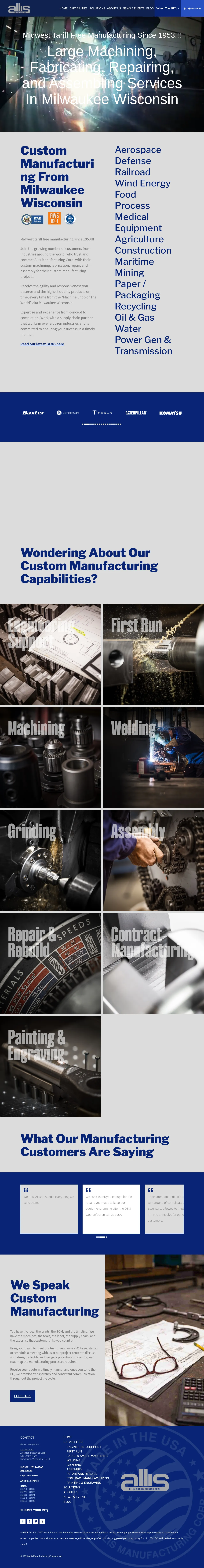 Allis Manufacturing Corp. provides large-part machining, metal fabrication, repair and assembly services from Milwaukee, Wisconsin. The company performs custom work including rotor and gearbox housing fabrication, welding of structural and automation frames, and finishing services such as painting and engraving. It supports projects for a wide range of industries including aerospace, defense, railroad, wind energy, food processing, medical equipment, agriculture, construction, maritime, mining, paper/packaging, recycling, oil & gas, water, and power generation. Services cover both one-off repairs and full manufacturing of complex assemblies.