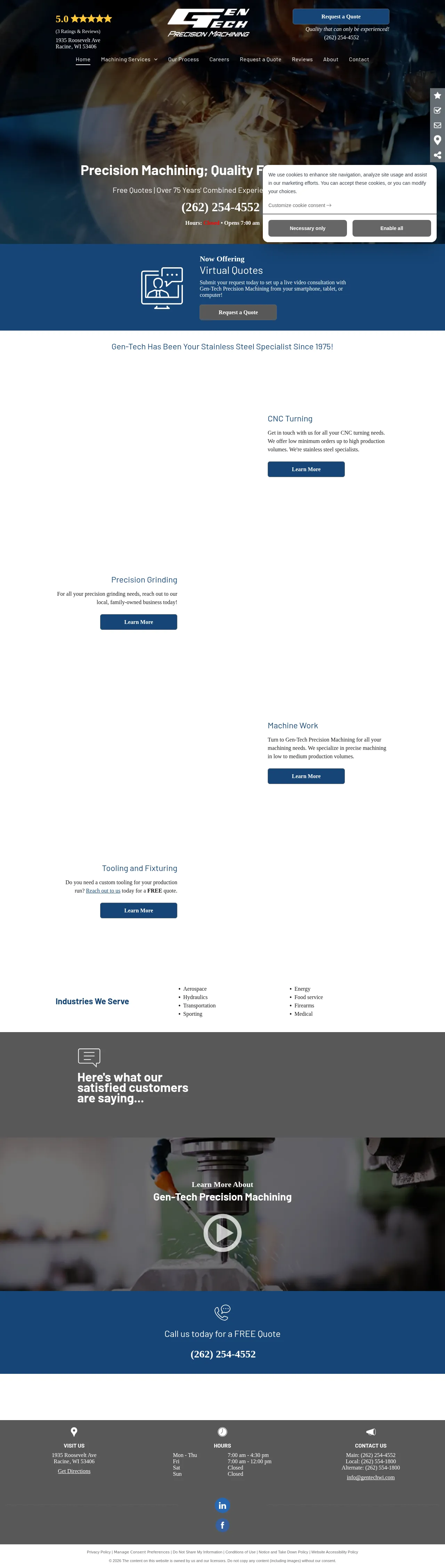 Gen-Tech Precision Machining is a machine manufacturing firm based in Racine, Wisconsin. The company provides CNC turning, precision grinding, general machine work, and custom tooling and fixturing. It specializes in stainless steel components and typically serves low-to-medium production volumes.