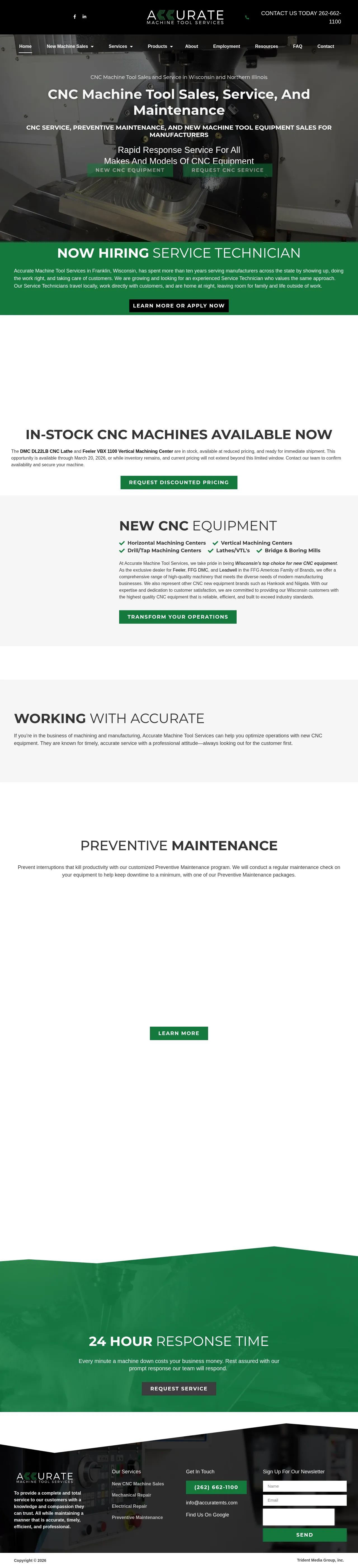 Accurate Machine Tool Services is a CNC equipment dealer and service provider based in Franklin, Wisconsin. The company sells new CNC machines across the state and supplies mechanical and electrical repair, preventive maintenance, and 24-hour emergency response for manufacturers in Wisconsin and northern Illinois. Technicians service all makes and models of industrial CNC equipment and have more than 100 years of combined experience. Services are offered on-site to minimize customer downtime.