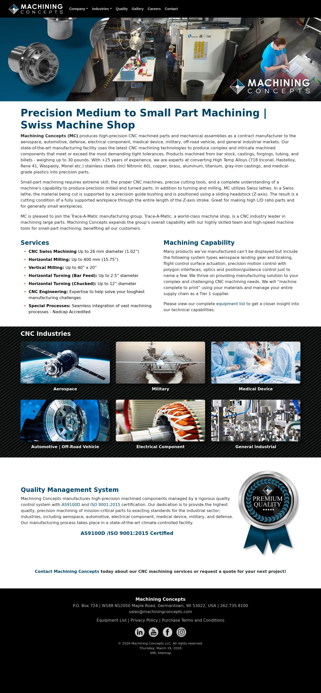 Machining Concepts is a contract manufacturer of high-precision small-to-medium machined parts and mechanical assemblies for aerospace, automotive, medical device, military, and general industrial markets. The company operates a climate-controlled, AS9100D / ISO 9001:2015 certified facility in Germantown, WI and uses CNC machining technologies to produce complex components to tight tolerances. It machines parts from bar stock, castings, forgings, tubing, and billets, with finished piece weights up to 30 pounds. Machining Concepts has provided machining services since 1995.