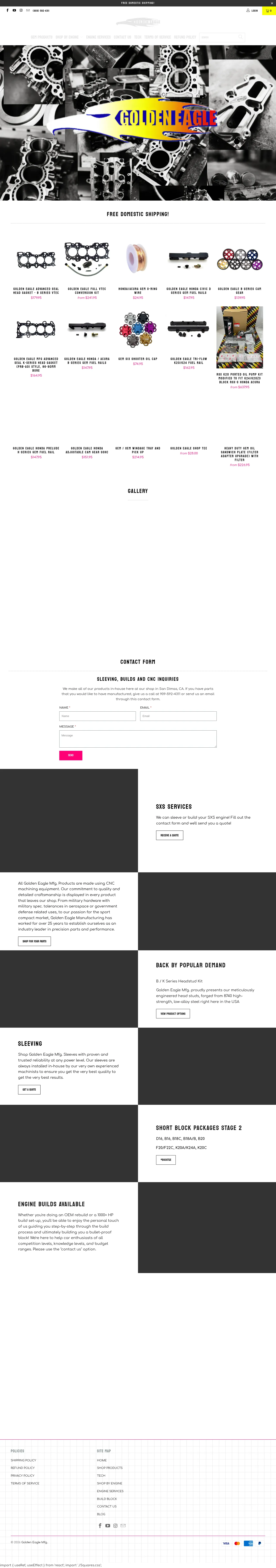 Golden Eagle Mfg. is a San Dimas, California-based manufacturer specializing in precision engine components and performance parts for the sport compact market. The company provides comprehensive services including engine block sleeving, custom engine builds, and CNC machining for a variety of automotive applications. Their expertise extends to serving high-performance sectors, including government and aerospace defense projects, by adhering to rigorous tolerance standards. With over 25 years of industry experience, the firm emphasizes in-house craftsmanship and quality control throughout the manufacturing process. They support both professional competition builds and OEM-level engine rebuilds with technical guidance and engineered high-strength components.