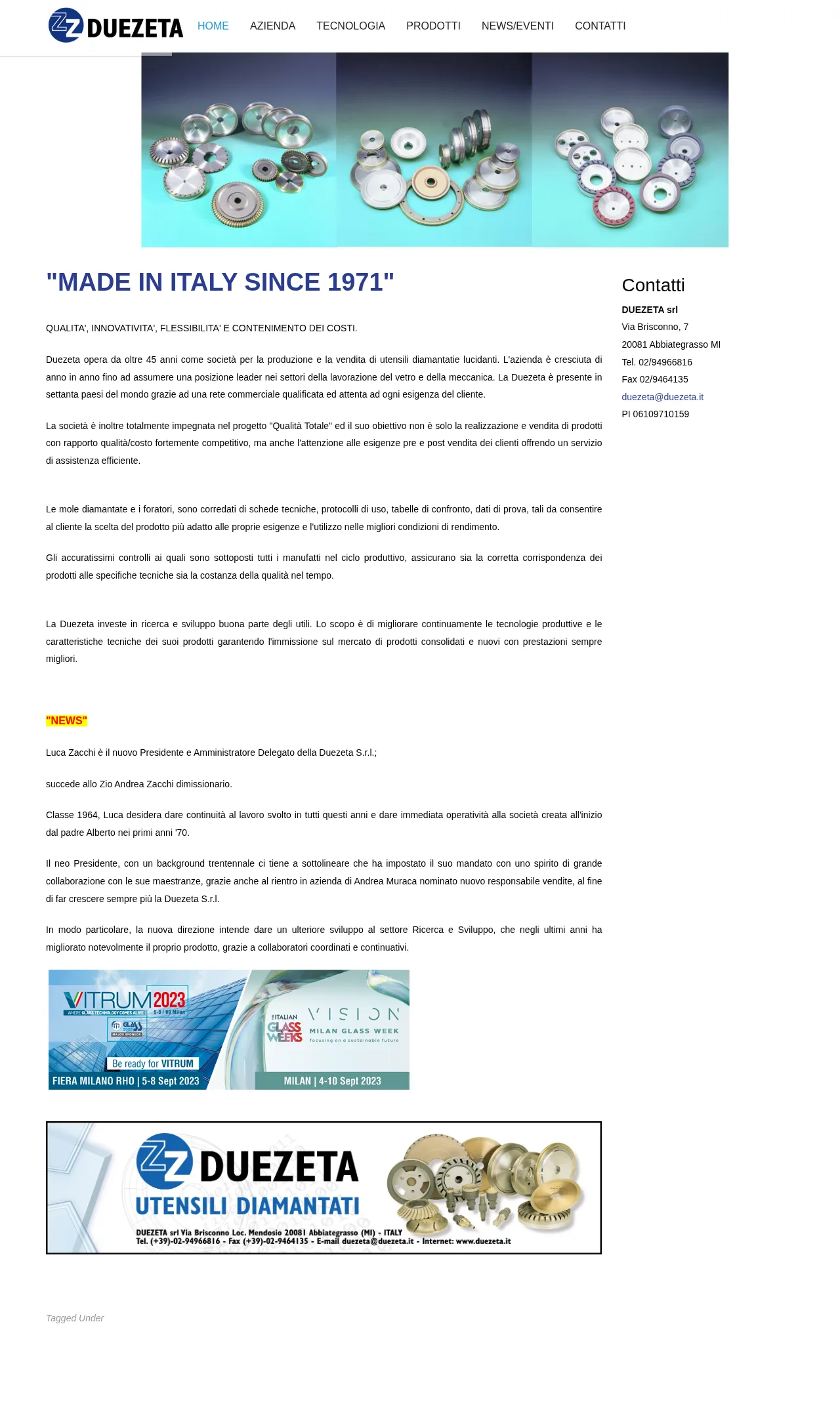 DUEZETA srl is a manufacturer of precision diamond tools with operations based in Italy since 1971. The company specializes in the design and production of tooling for the glass, mechanical, and woodworking industries. They utilize advanced CAD systems and automated CNC manufacturing processes to ensure high-performance product development. Their internal quality control laboratory performs rigorous testing on all products to ensure consistent adherence to technical specifications. Through an dedicated research department, the company continuously improves its product range and develops customized solutions to meet evolving industrial requirements.