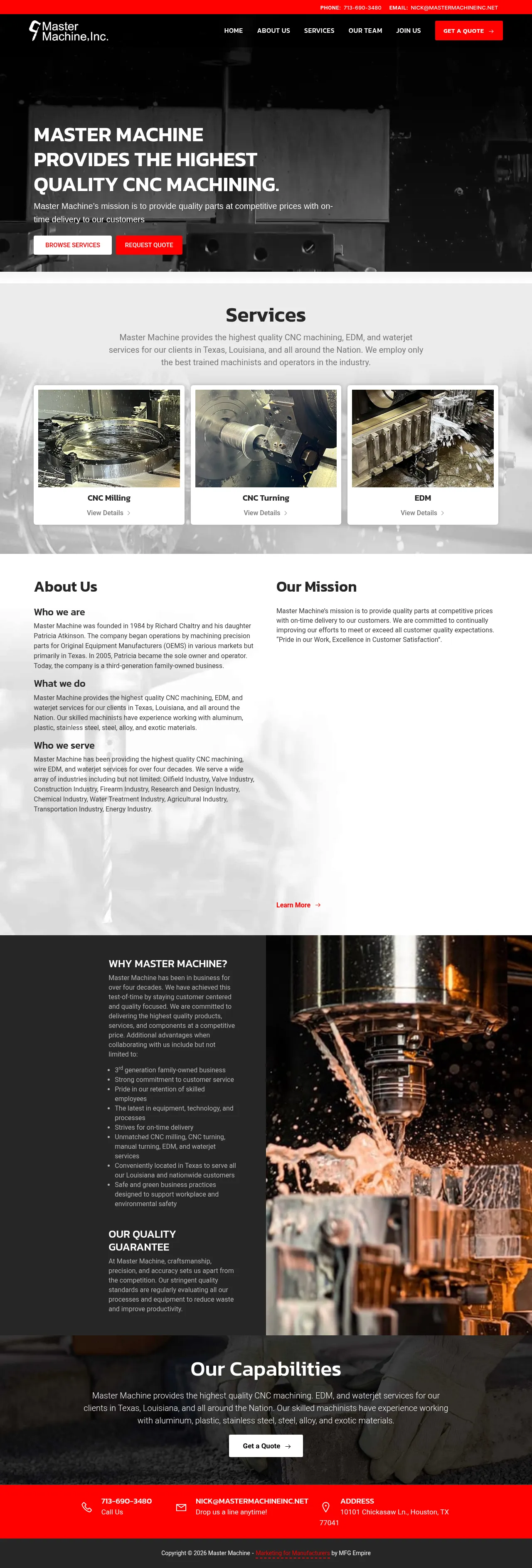 Established in 1984, Master Machine is a third-generation family-owned manufacturer providing high-precision machining services. The company specializes in CNC milling, CNC turning, EDM, and waterjet cutting for a diverse range of sectors, including the oilfield, chemical, agricultural, and energy industries. Operating from Houston, Texas, the facility serves clients nationwide with a focus on quality, precision, and on-time delivery. Their team combines extensive industry experience with modern technology to produce components for OEMs and various research and development applications. Master Machine prioritizes customer satisfaction through rigorous quality control processes designed to minimize waste and ensure product accuracy.