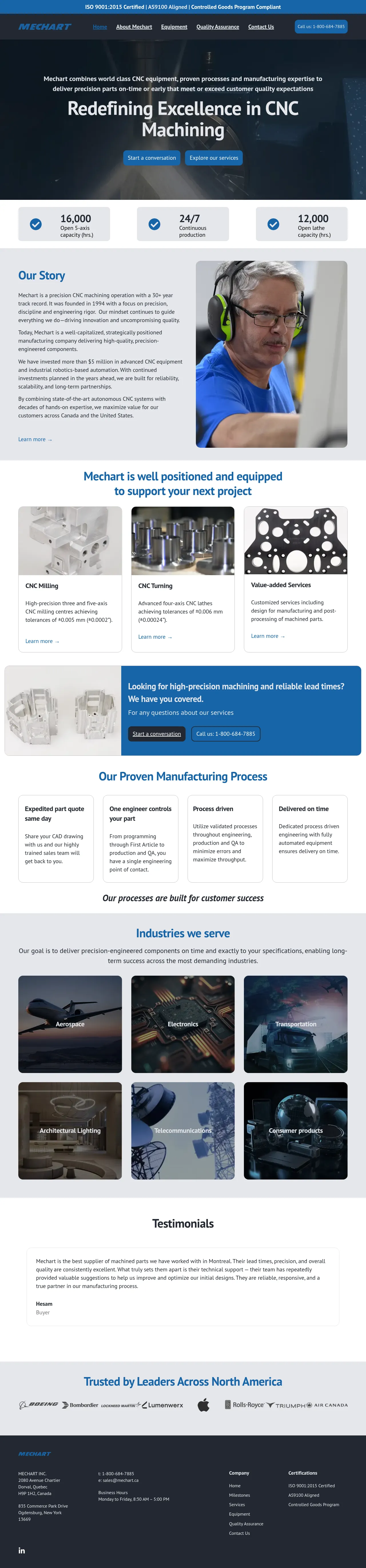 Mechart Inc. is a precision manufacturing firm specializing in high-tolerance CNC milling and turning services. The company supports a diverse range of sectors including aerospace, electronics, telecommunications, and transportation. By utilizing automated industrial robotics and advanced multi-axis machining, they provide scalable solutions for complex component production. Their service model emphasizes engineering-led production, with a dedicated contact overseeing the entire lifecycle from programming to quality assurance. With facilities in Canada and the United States, Mechart is recognized for its commitment to reliability, technical support, and strict adherence to process-driven quality standards.