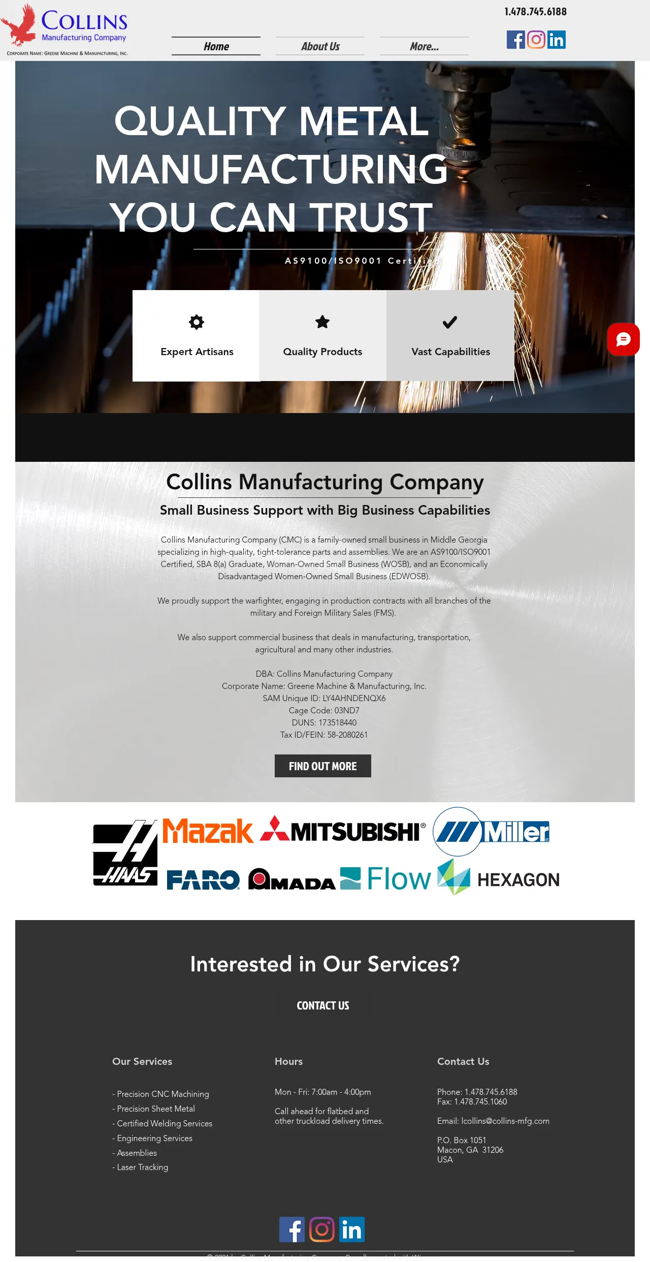 Collins Manufacturing Company is a family-owned, woman-owned small business based in Middle Georgia specializing in precision machining, sheet metal fabrication, and complex assemblies. The company serves diverse industries, including aerospace, commercial manufacturing, agriculture, and transportation. With multiple facilities, they provide end-to-end solutions ranging from engineering and CNC programming to certified welding and laser tracking. Their operations are supported by a commitment to rigorous quality standards and a team of experienced artisans. The firm is recognized for its ability to handle high-precision, tight-tolerance projects and large-scale assembly work.