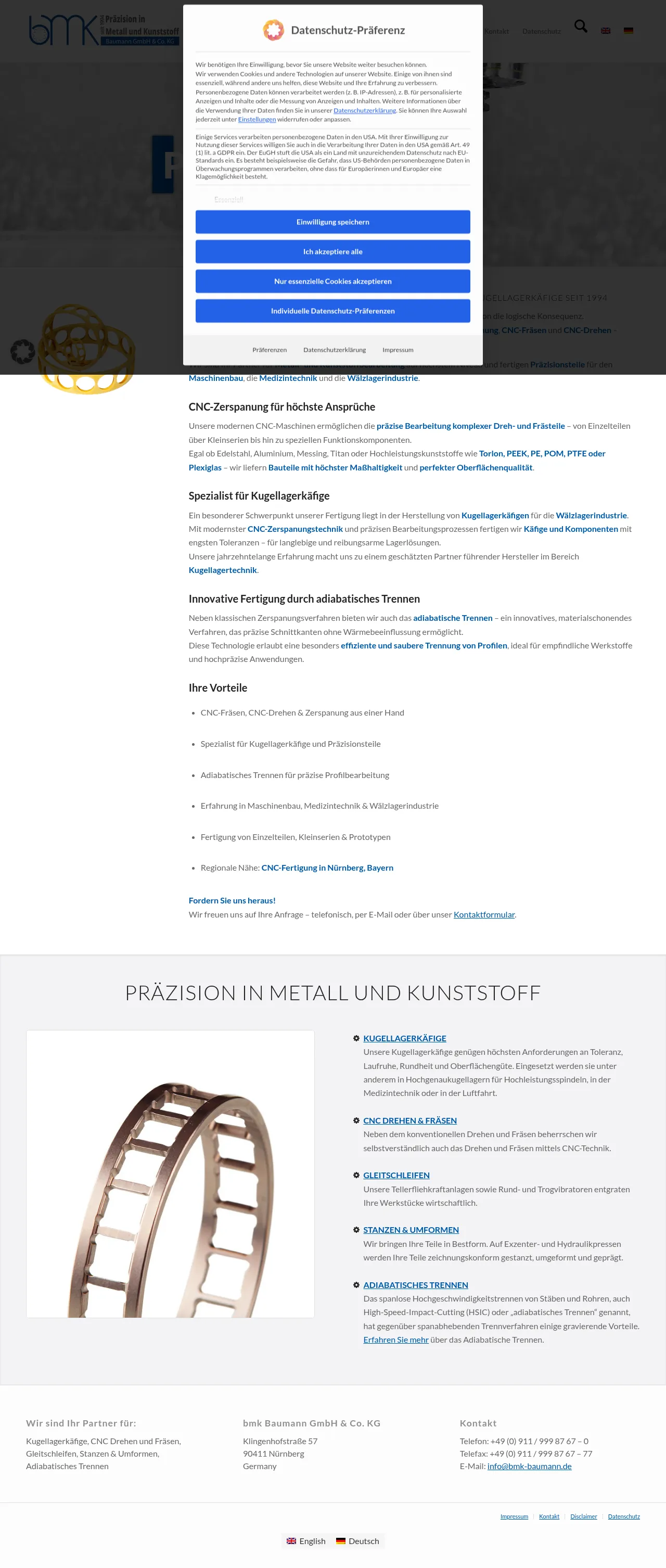 BMK Baumann is a high-precision manufacturing company based in Nuremberg, Germany, specializing in the production of complex components and ball bearing cages. Established in 1994, the firm provides comprehensive CNC machining services including milling, turning, and innovative adiabatic cutting for a variety of industries such as medical engineering and aerospace. The facility is equipped to handle everything from individual prototypes to small-batch series, ensuring strict adherence to dimensional tolerances and high surface quality. Beyond traditional machining, the company offers vibratory grinding, laser marking, and sheet metal forming services. They support a diverse range of materials, including high-performance plastics and various metals, to meet specific mechanical and friction-reduction requirements.