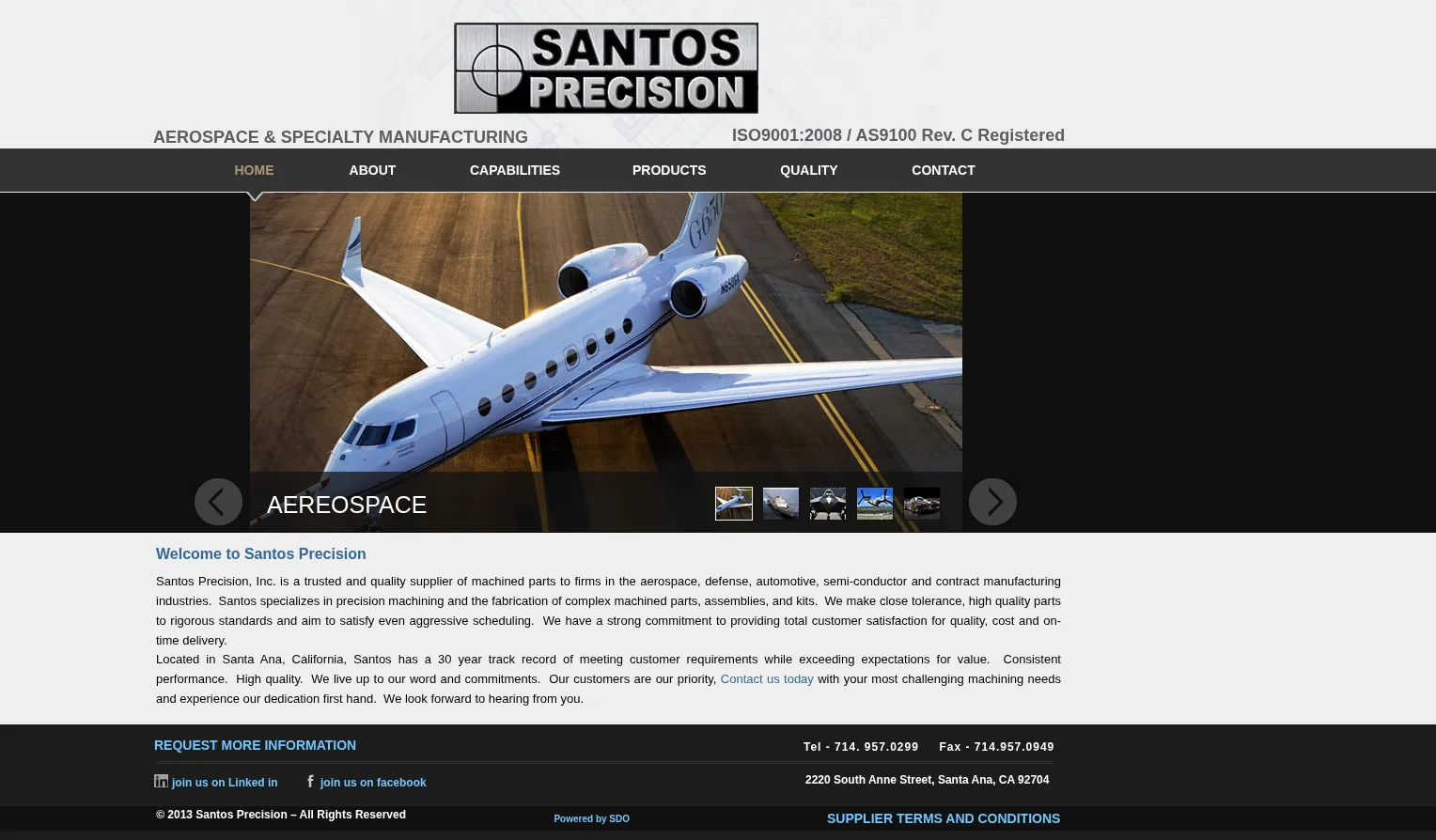 Santos Precision is a precision manufacturing company serving the aerospace, defense, and specialty engine industries. It operates a machining and fabrication facility in Santa Ana, California, producing components and assemblies to industry specifications. The company maintains recognized quality registrations to support regulated sectors.
