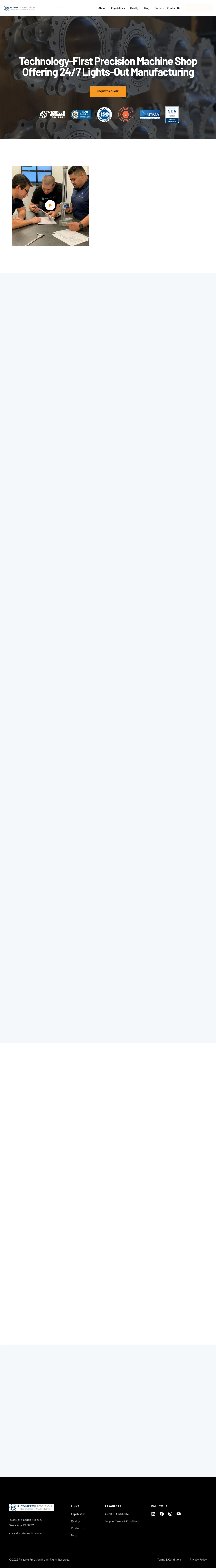 RICAURTE PRECISION is a precision machine shop in Orange County, California that produces complex components for defense, medical device, aerospace, and space customers. The company offers CNC milling, multi-axis turning, Swiss screw machining, wire EDM and turnkey manufacturing services for difficult-to-machine metals and high-performance plastics. It operates lights-out automated production for scalable 24/7 manufacturing and maintains traceable inspection and calibration systems.