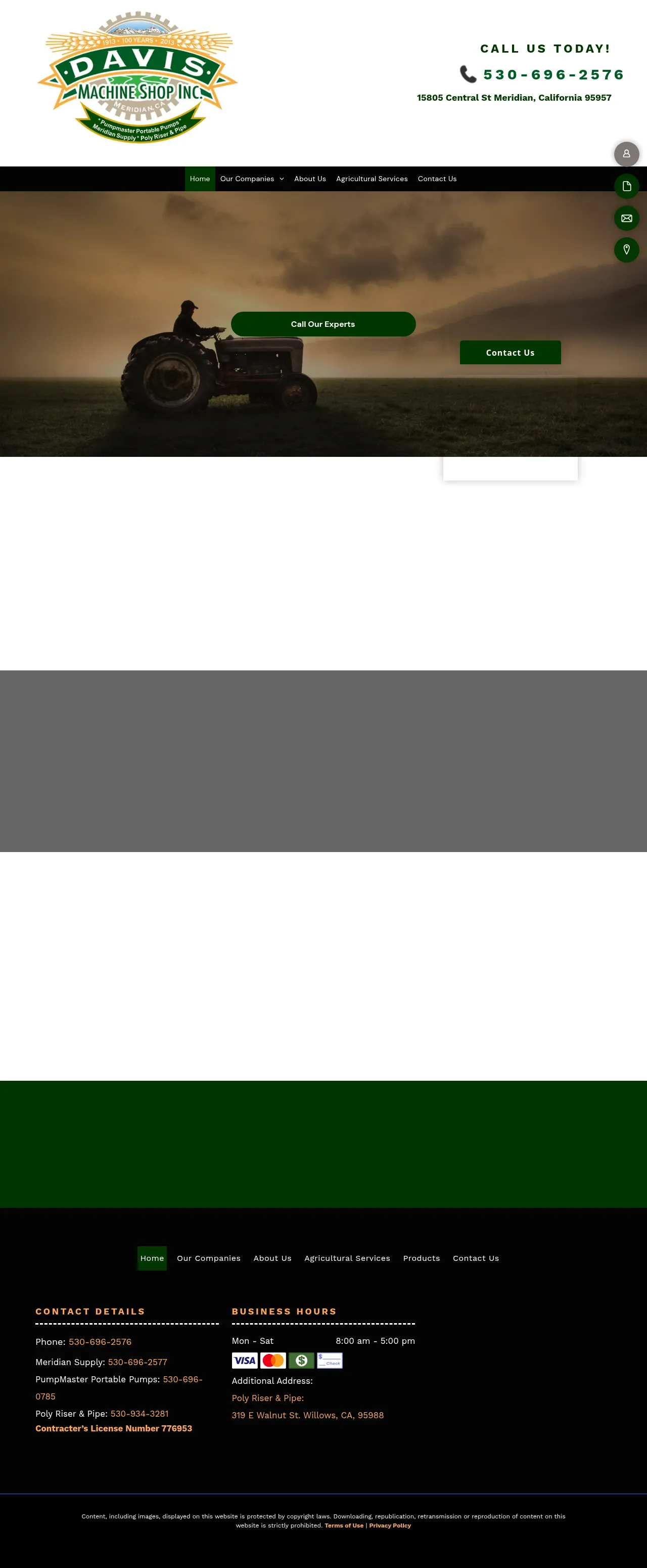 Established in 1913, Davis Machine Shop Inc. provides full-service machining, fabrication, and repair services for the agricultural and industrial sectors. The company specializes in the design, manufacturing, and maintenance of various pump systems, including low lift, river, line shaft turbine, and portable diesel-powered units. In addition to custom fabrication, they operate an extensive supply store offering hardware, power transmission equipment, irrigation components, and safety supplies. With deep regional expertise, the company serves clients across northern California by combining traditional blacksmithing roots with modern manufacturing capabilities. They offer both equipment sales and rental services to support diverse irrigation, drainage, and industrial infrastructure needs.