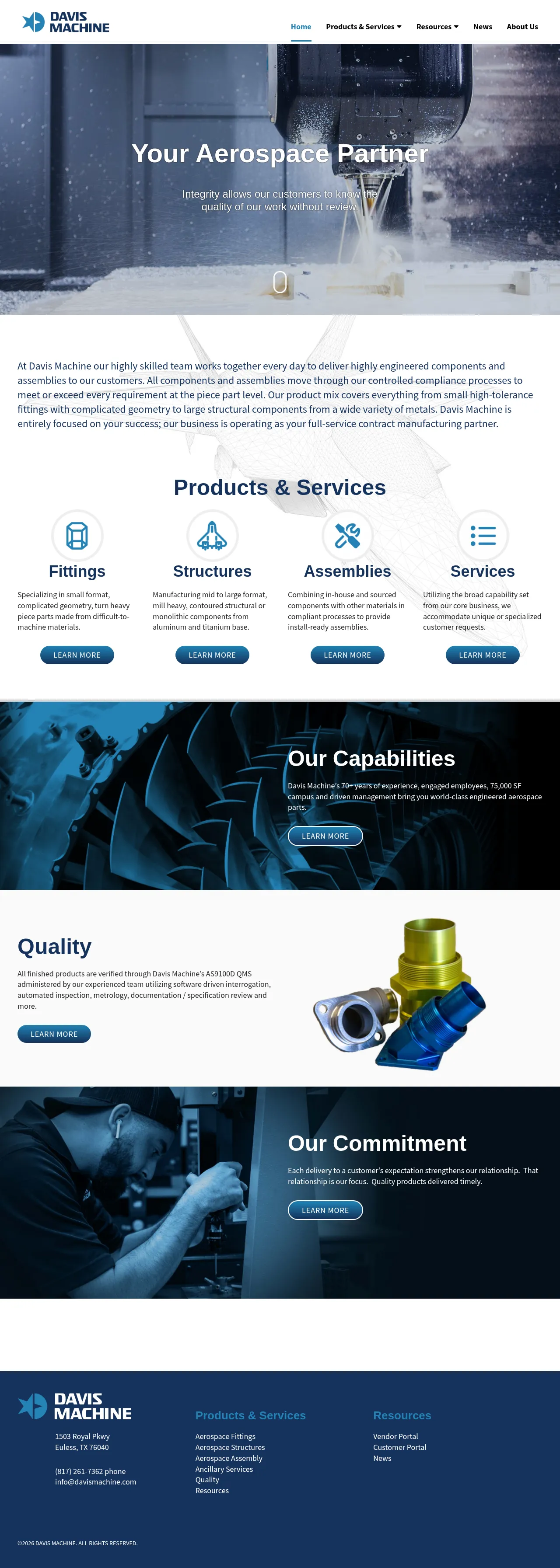 Davis Machine is a full-service contract manufacturer specializing in high-tolerance aerospace components. The company produces complex small-format fittings and large-scale structural monolithic parts for the aerospace industry. With over 70 years of experience, the firm manages production across a 75,000-square-foot facility, providing both piece-part manufacturing and integrated, install-ready assemblies. Their operations are supported by a rigorous quality management system that ensures compliance with stringent technical specifications through automated metrology and inspection. Davis Machine emphasizes collaborative partnerships to deliver engineering-driven solutions for unique and challenging manufacturing requirements.