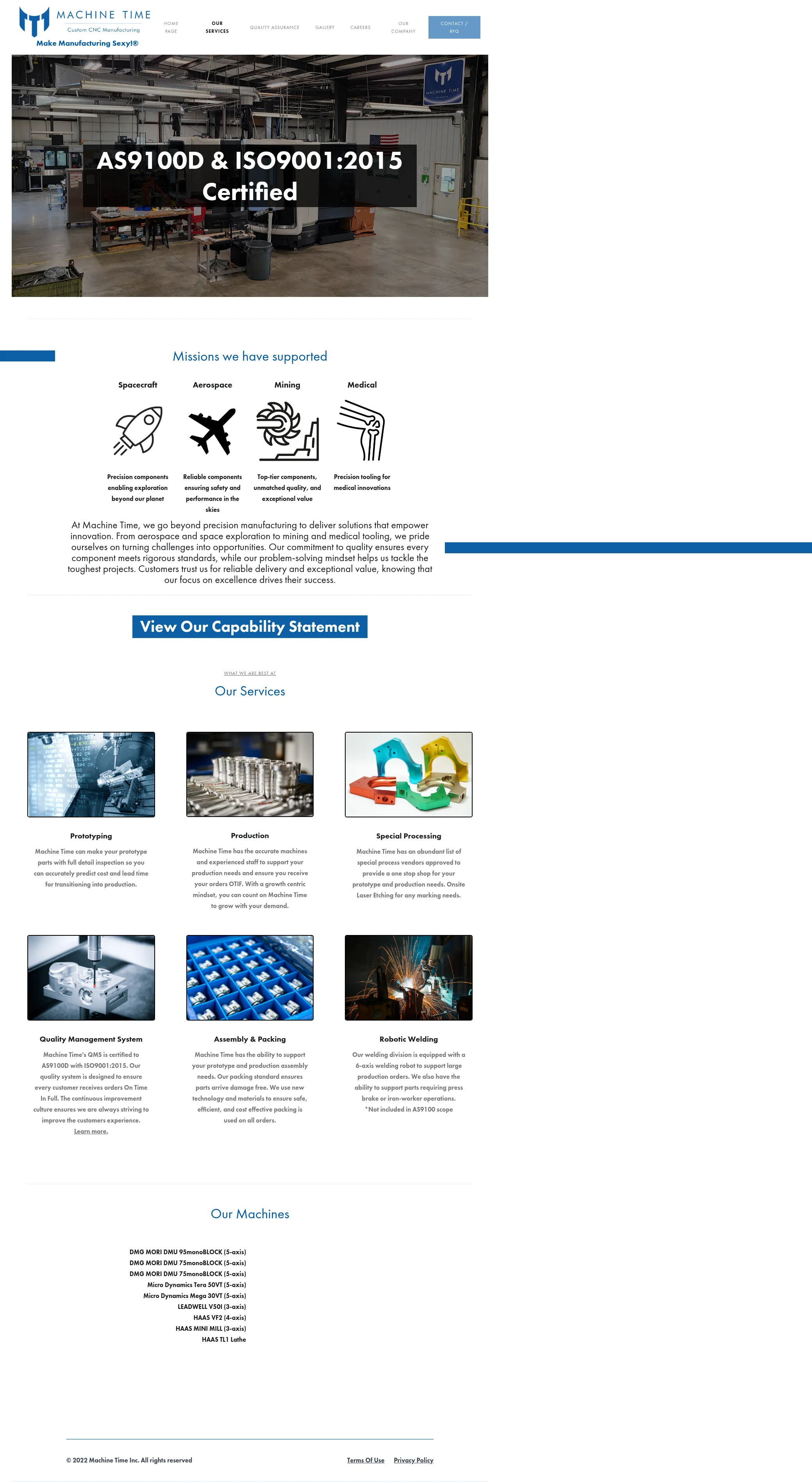 Machine Time Inc. is a precision manufacturing company supplying components and assemblies for aerospace, spacecraft, mining, and medical applications. The company provides prototyping through production services using 3-, 4-, and 5-axis CNC machining, robotic welding, and climate-controlled inspection. Facilities near Lexington, Kentucky support production runs, inspection, and secondary operations to meet regulated quality requirements.