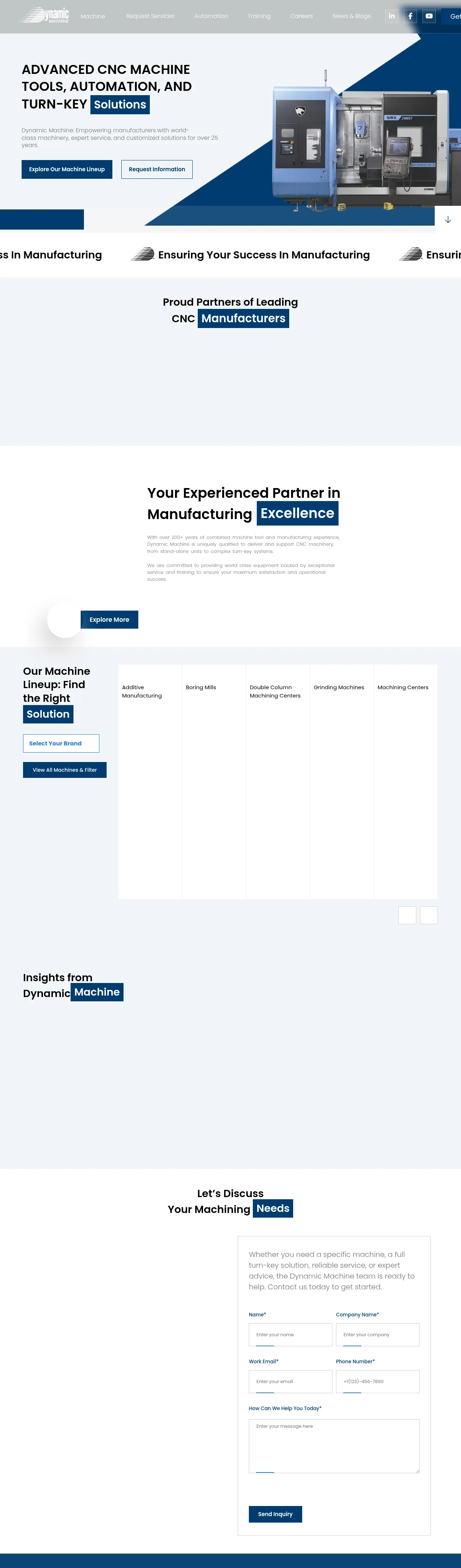 Dynamic Machine is an industrial supplier of CNC machine tools and automation systems, providing solutions for over 25 years. The company offers a comprehensive range of equipment, including boring mills, grinding machines, and multi-axis turning centers. They serve a diverse client base across the aerospace, automotive, medical, defense, and energy sectors. Beyond machinery, the firm specializes in turn-key integration, process engineering, and technical training. With over 200 years of combined industry experience, they support operations ranging from individual machine setups to complex, integrated manufacturing systems.
