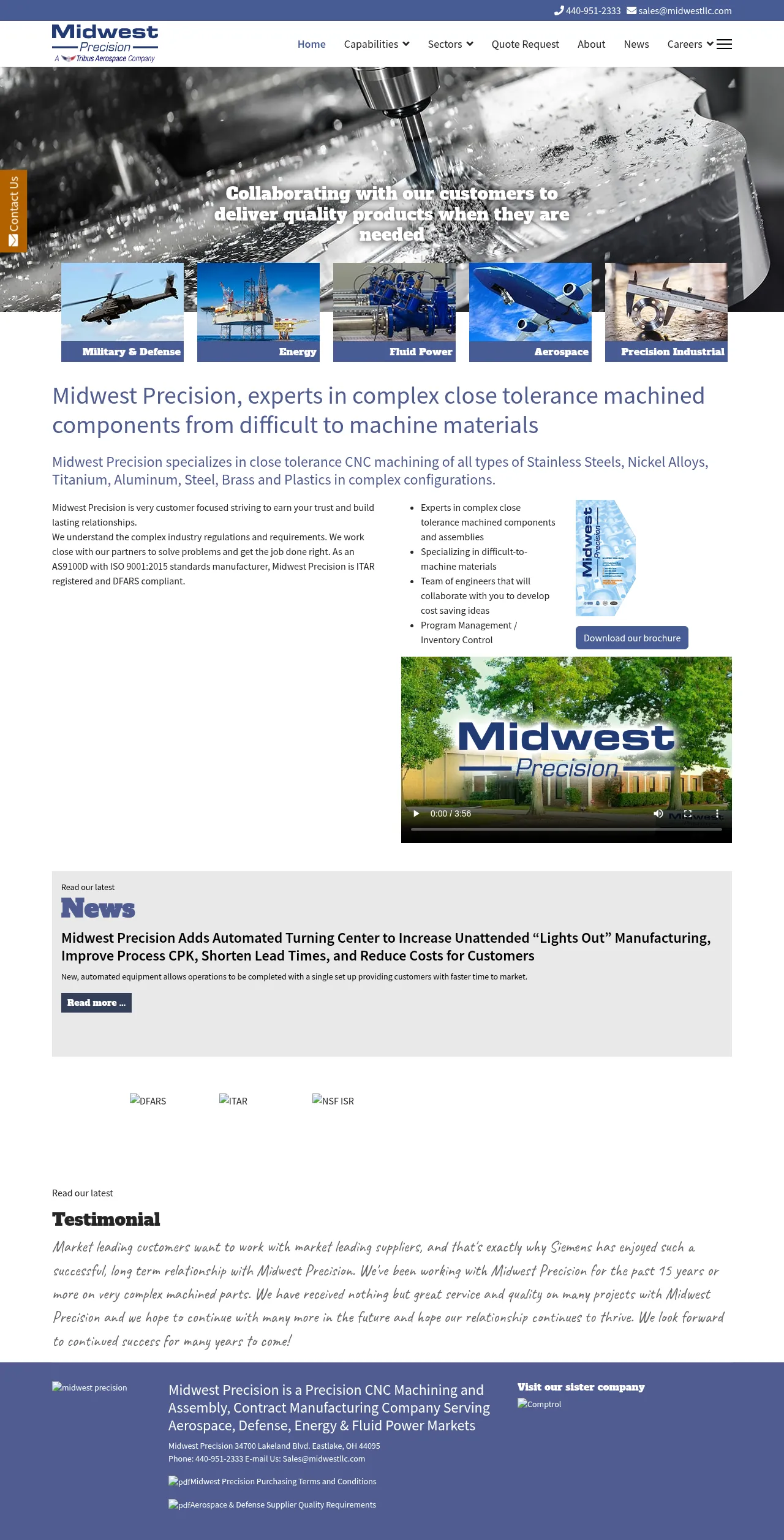 Midwest Precision is a contract manufacturer specializing in precision CNC machining and assembly for industries including aerospace, defense, energy, and fluid power. The company provides comprehensive services such as precision turning, milling, grinding, honing, and EDM to produce complex components with tight tolerances. They utilize lean manufacturing tools and visual management to enhance efficiency and maintain high quality standards. Midwest Precision supports customers through long-term supply agreements, inventory management, and a dedicated quality assurance lab. Their facility is equipped with automated machinery to support high-volume production and consistent traceability.