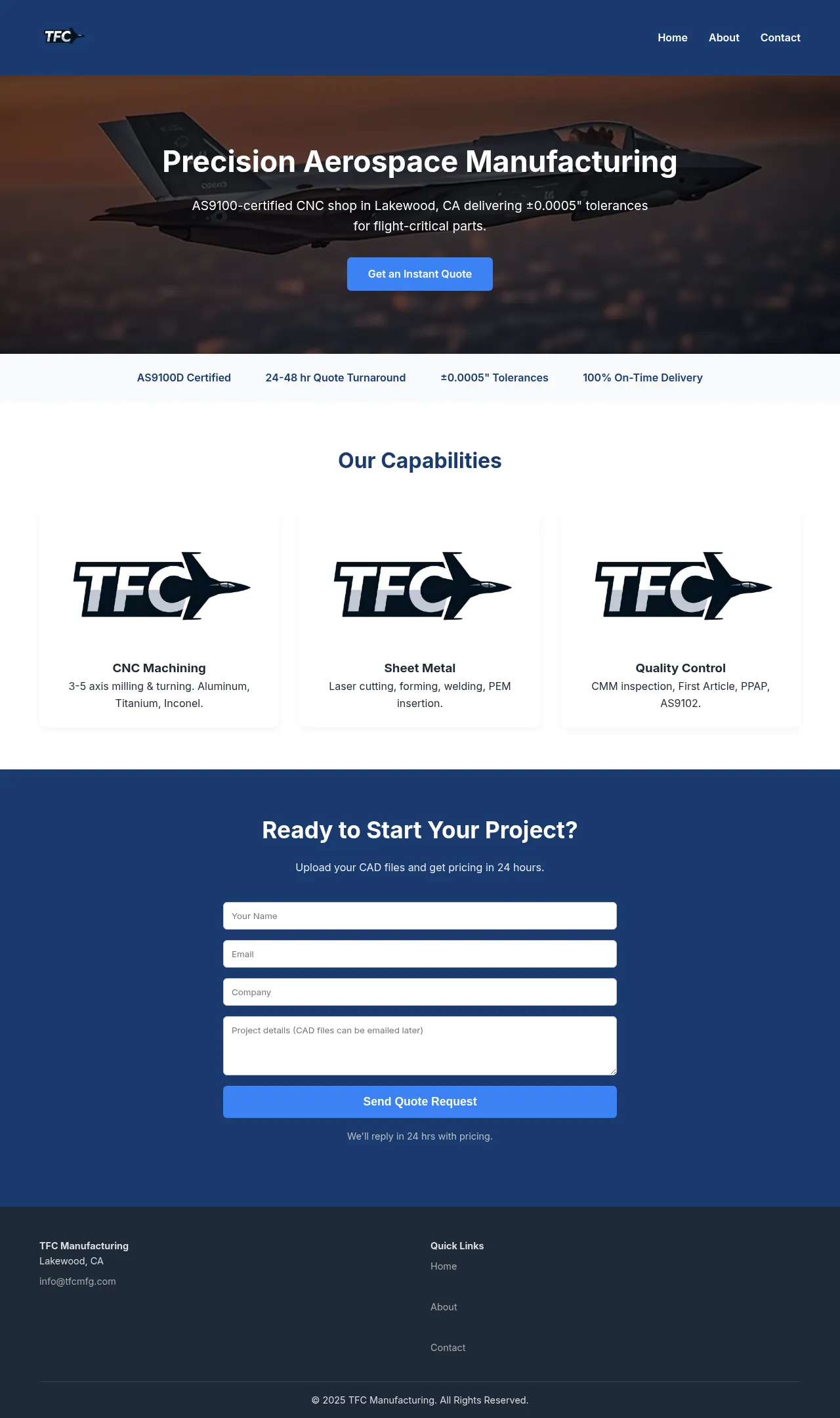 TFC Manufacturing is an AS9100-certified facility based in Lakewood, California, specializing in precision aerospace components. The company provides comprehensive CNC machining and sheet metal fabrication services to support flight-critical manufacturing requirements. Their core capabilities include laser cutting, metal forming, welding, and PEM insertion. They maintain high quality standards with services such as CMM inspection, First Article, and AS9102 reporting. Known for technical accuracy, they routinely achieve tolerances of ±0.0005 inches and guarantee prompt 24 to 48-hour quote turnarounds.