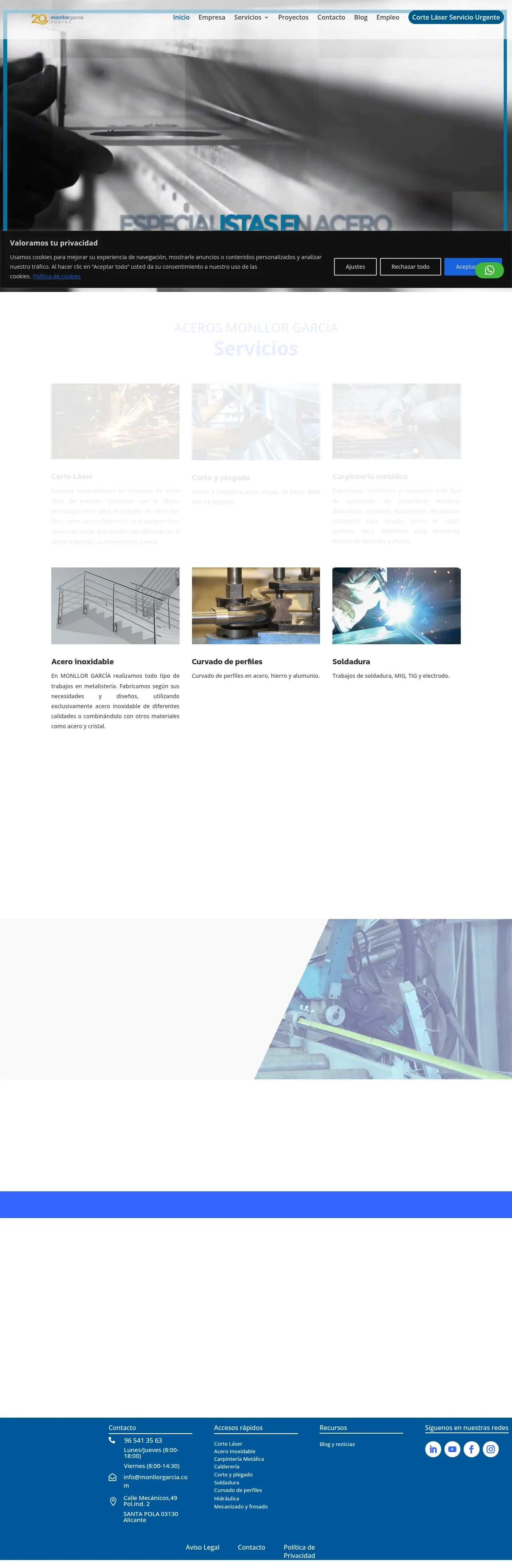 Monllor García is a metalworking company based in Alicante with over 20 years of experience providing comprehensive industrial manufacturing solutions. The firm specializes in precision laser cutting, metal fabrication, and assembly services for the industrial, naval, automotive, construction, and interior design sectors. Their capabilities include advanced cutting, folding, welding, and machining of various metal components. They provide end-to-end service, offering technical consultation to ensure the most cost-effective material and system selections for client projects. The company operates from a facility in Santa Pola, managing projects ranging from custom prototype development to large-scale production series.