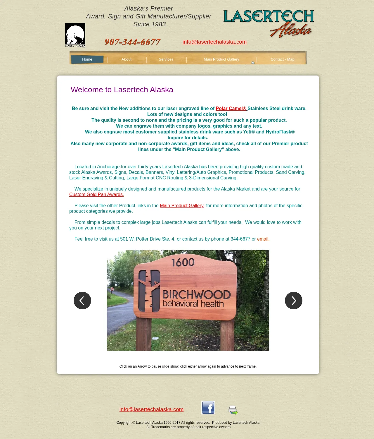 Lasertech Alaska provides laser engraving and custom award services, specializing in personalized awards and engraved stainless-steel drinkware. The company produces custom gold pan awards and engraves company logos, graphics and text on corporate and non‑corporate gift items. Product offerings and new additions are presented in a main product gallery.