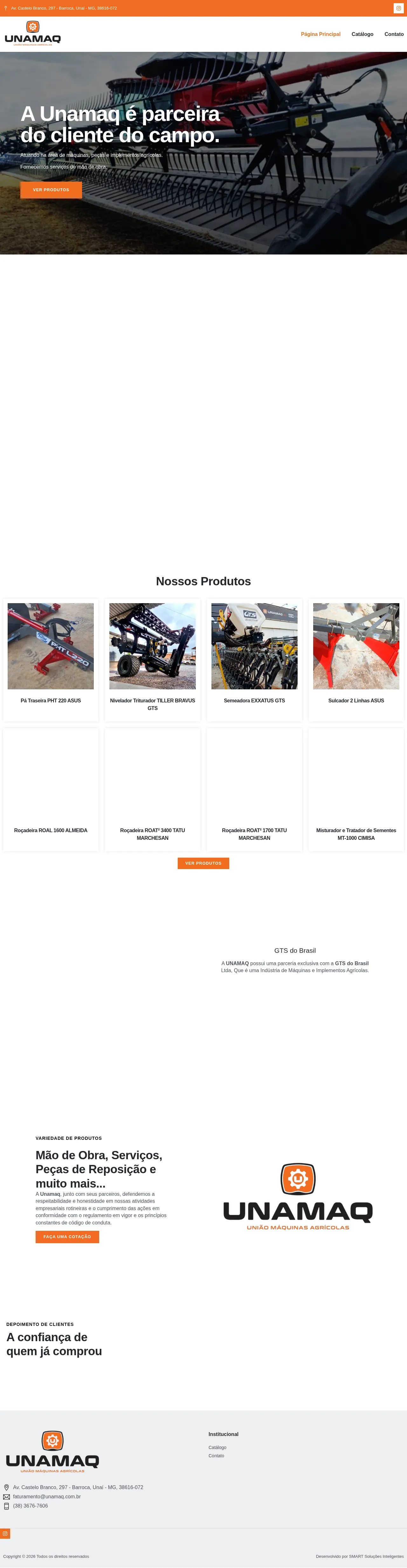 Established in 2013 and located in Unaí, Minas Gerais, Unamaq is a professional supplier specializing in agricultural machinery, parts, and implements. The company serves the agricultural sector by providing a diverse catalog of high-performance equipment and technical maintenance services. Committed to business ethics and transparency, Unamaq maintains a strategic partnership with GTS do Brasil to deliver advanced agricultural solutions. Their operations focus on supporting regional field productivity through reliable labor, replacement parts, and equipment maintenance. The organization operates under a strict code of conduct to ensure integrity in all professional relationships.