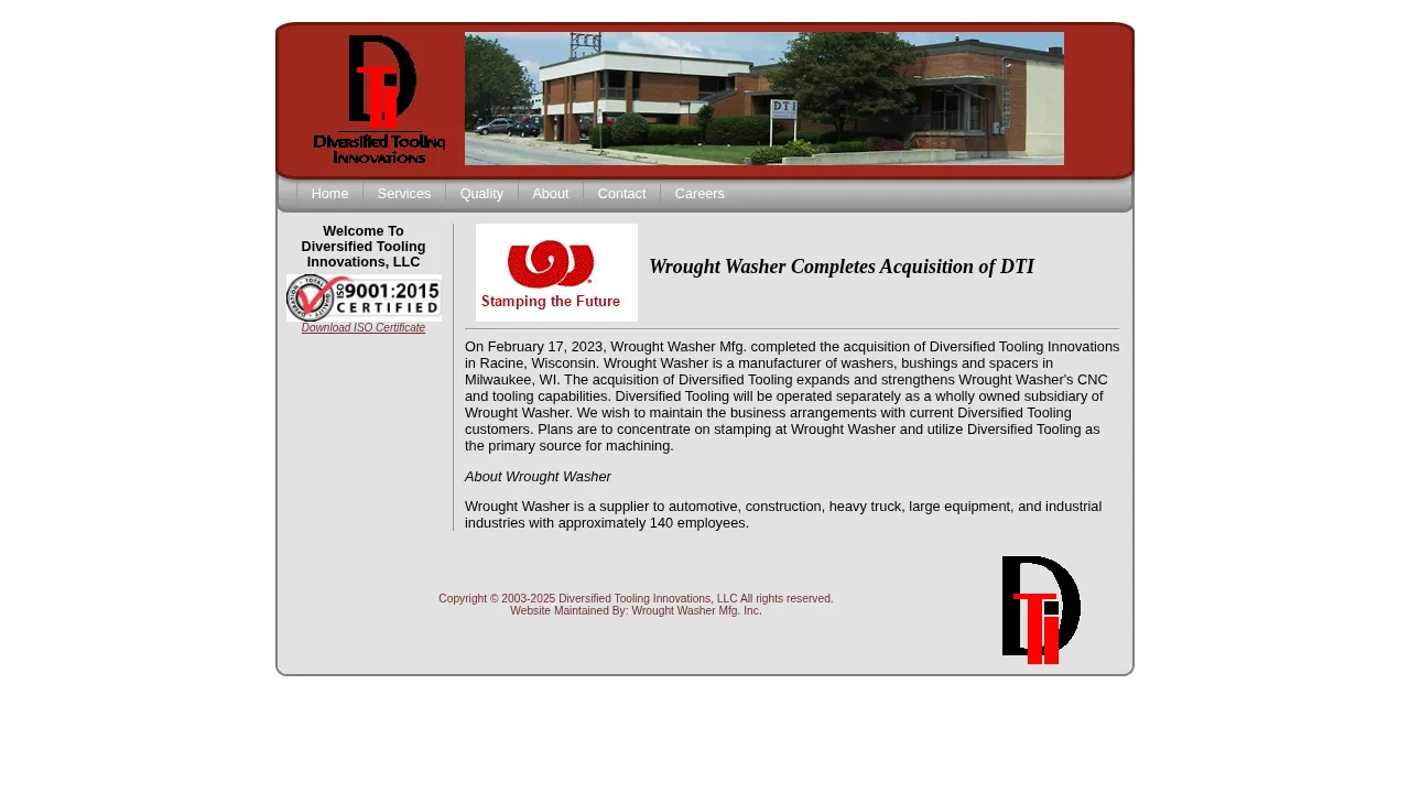 Diversified Tooling Innovations, LLC is a Wisconsin-based manufacturer specializing in precision CNC turning, milling, and grinding services. Now a wholly owned subsidiary of Wrought Washer Mfg., the company serves as the primary machining resource for high-volume industrial clients. They support a diverse range of sectors, including the automotive, construction, heavy truck, and large equipment industries. By leveraging specialized tooling capabilities, the company maintains high-precision standards for complex parts production. The organization operates as a dedicated machining provider while supporting the stamping and manufacturing objectives of its parent company.