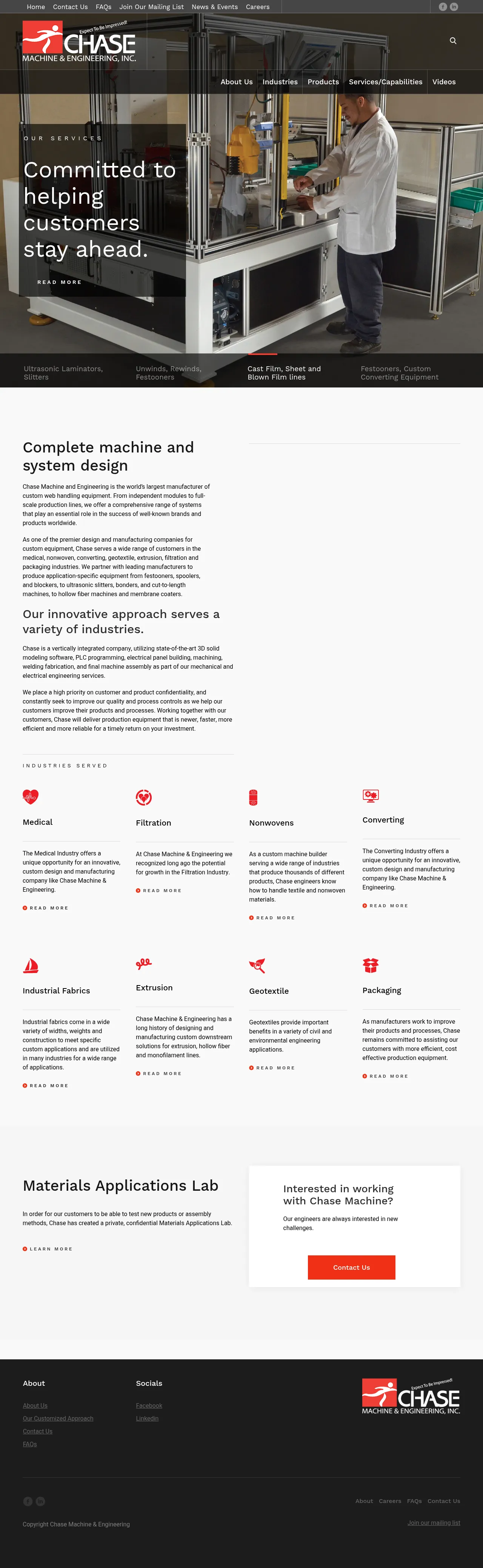 Chase Machine and Engineering is a global manufacturer specializing in custom web handling and processing equipment. The company provides integrated design, engineering, and manufacturing services for industries including medical, filtration, nonwovens, converting, and packaging. Their in-house capabilities encompass 3D modeling, PLC programming, electrical panel assembly, and precision fabrication. They operate a private materials applications lab to assist clients in product development and assembly testing. Through a vertically integrated approach, the firm delivers tailored systems ranging from independent modules to complete production lines.