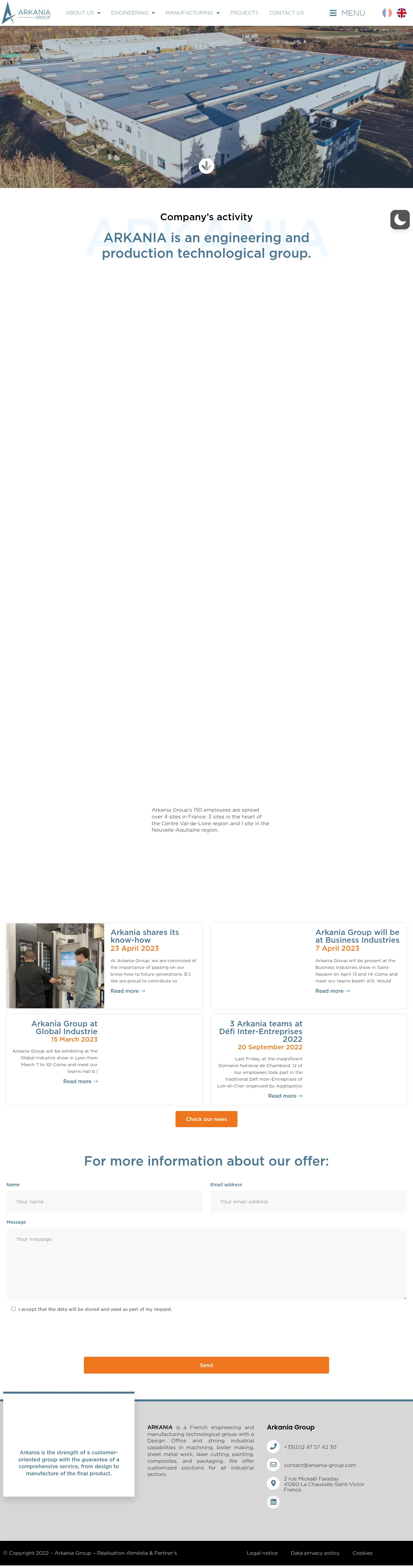 Arkania Group is a French engineering and manufacturing collective specializing in the full product lifecycle, from design and prototyping to mass production. Their technical capabilities span machining, boiler making, precision laser sheet metal work, and composite manufacturing. The company serves diverse industrial sectors by providing co-development, structural calculation, and comprehensive assembly services. With four production sites across France, Arkania offers end-to-end support including packaging and line-side delivery. They are distinguished by their commitment to internal expertise and their ability to integrate complex sub-assemblies into final, client-ready solutions.