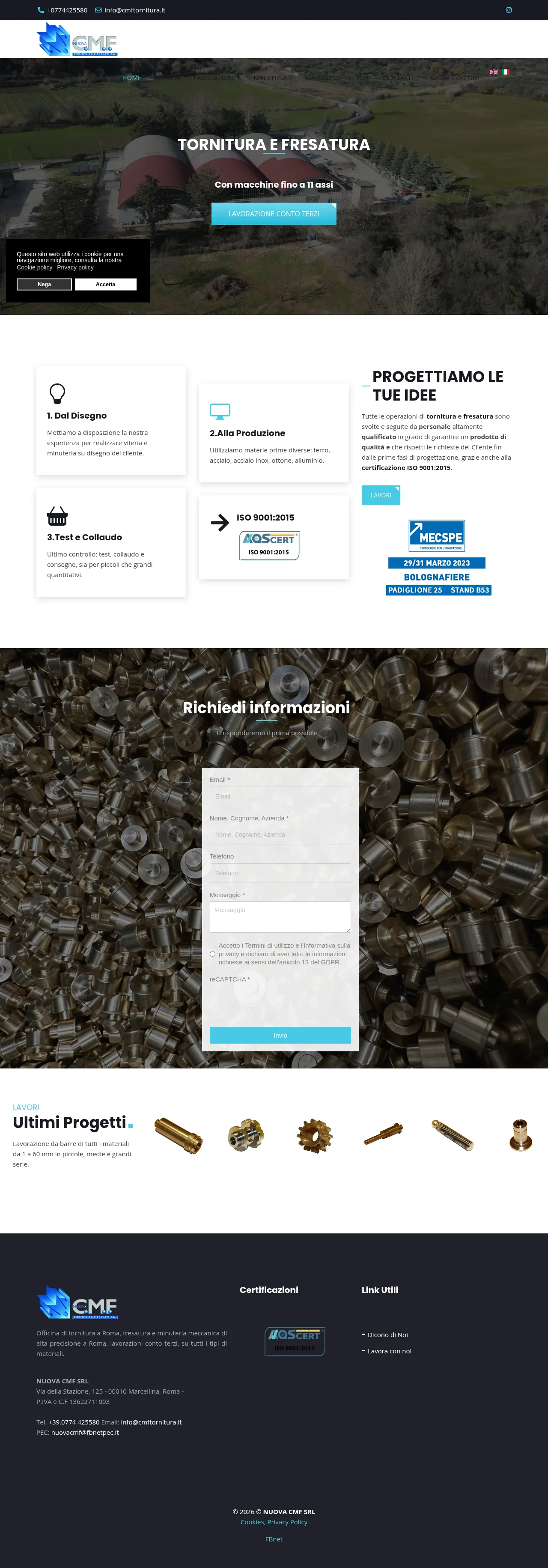 Nuova CMF Srl is a precision mechanical workshop based in Marcellina, Rome, specializing in third-party machining services. The company provides turning, milling, drilling, and marking services for various materials, including metal and plastic, using advanced CNC technology with up to 11-axis capabilities. They cater to a diverse range of industries such as automotive, aerospace, naval, medical, military, fashion, and pneumatics. With over 40 years of experience, the company focuses on high-precision small and large-scale production while maintaining strict quality control through ISO 9001:2015 certified processes.