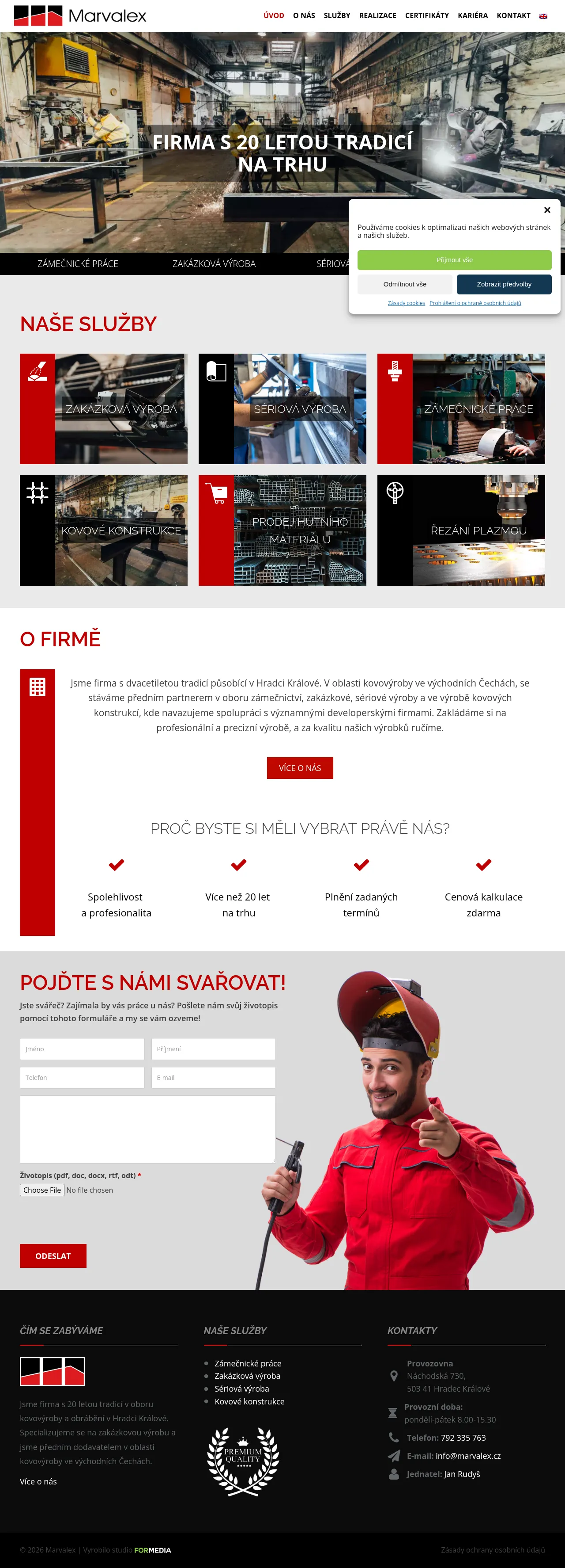 Marvalex s.r.o. is a metalworking company based in Hradec Králové with over 20 years of experience in the industry. The firm specializes in customized and batch production of steel and stainless steel structures, including frames, gates, fences, and various building components. Their service portfolio encompasses complete production cycles from material cutting and drilling to welding and surface finishing. They serve a diverse client base ranging from individual customers to large-scale developers, maintaining a focus on precision and quality. The company also offers the sale of metallurgical materials such as tubes, profiles, and metal sheets.