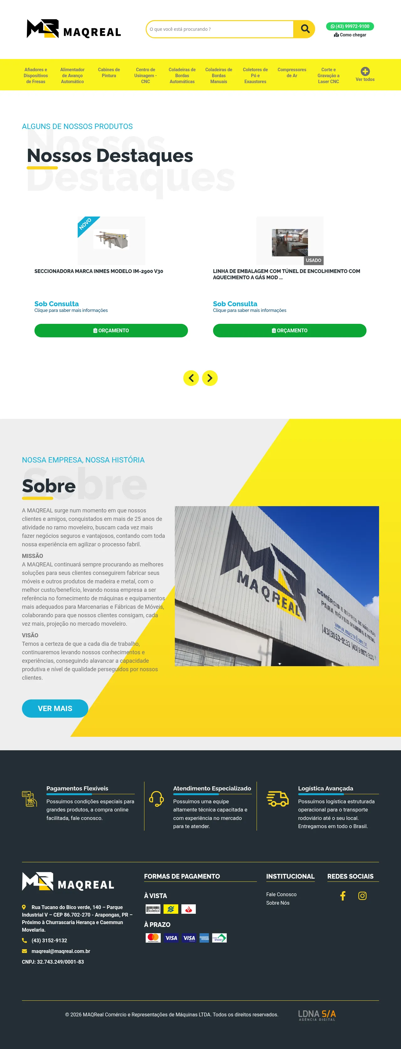 MAQREAL is a specialized provider of machinery and equipment for the woodworking and furniture manufacturing industries. With over 25 years of market experience, the company supplies both new and used industrial solutions, including CNC centers, edge banders, and heavy-duty sanding machines. They maintain a physical facility in Arapongas, PR, and provide structured logistics for national and international distribution. The company focuses on enhancing the production capacity and quality standards of its clients through technical expertise and professional maintenance services. In addition to equipment sales, they offer trade-in opportunities and tailored financing conditions to facilitate industrial investment.