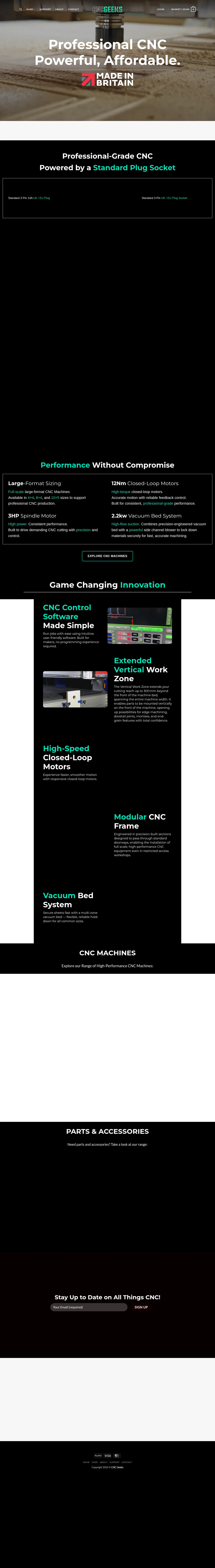 CNC Geeks is a UK-based manufacturer of high-performance CNC machinery designed for workshops, businesses, and hobbyists. The company specializes in modular, large-format CNC systems that are engineered to fit through standard doorways and operate on single-phase power. Their product range supports diverse applications including camper van conversions, prototyping, plastic panel processing, and light metal fabrication. By integrating advanced features such as AI-enhanced software, vacuum bed systems, and vertical work zones, they provide professional-grade capabilities to smaller workspaces. The company is committed to providing comprehensive support, including installation services and operator training.