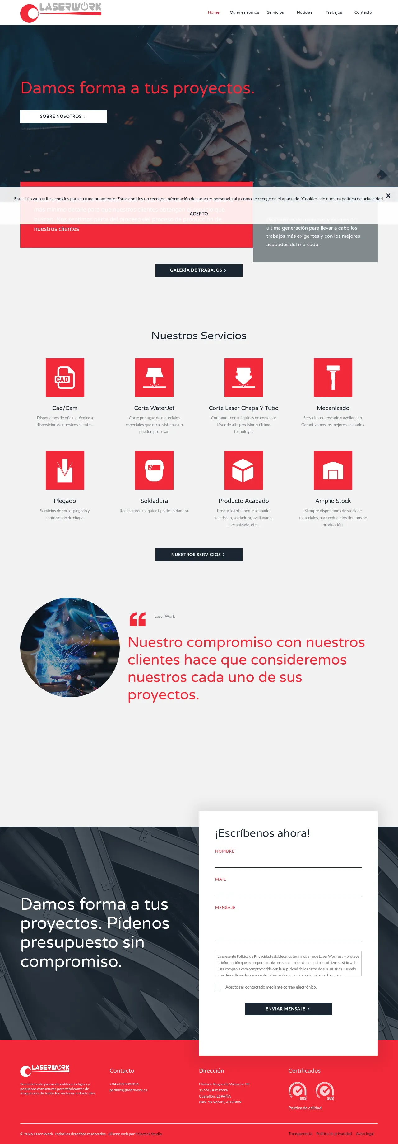 Laser Work is a metal fabrication company based in Almazora, Spain, specializing in laser cutting, machining, and metal forming services. Since 2013, they have served various industrial sectors by providing light boilermaking, small structural components, and fully finished products. The company utilizes advanced CAD/CAM technology and automated production systems to ensure high dimensional precision and quality. They provide comprehensive services, including welding, drilling, and finishing, supported by an in-house technical department for product optimization. Laser Work is committed to efficient production cycles and reliable delivery timelines for all manufacturing partners.