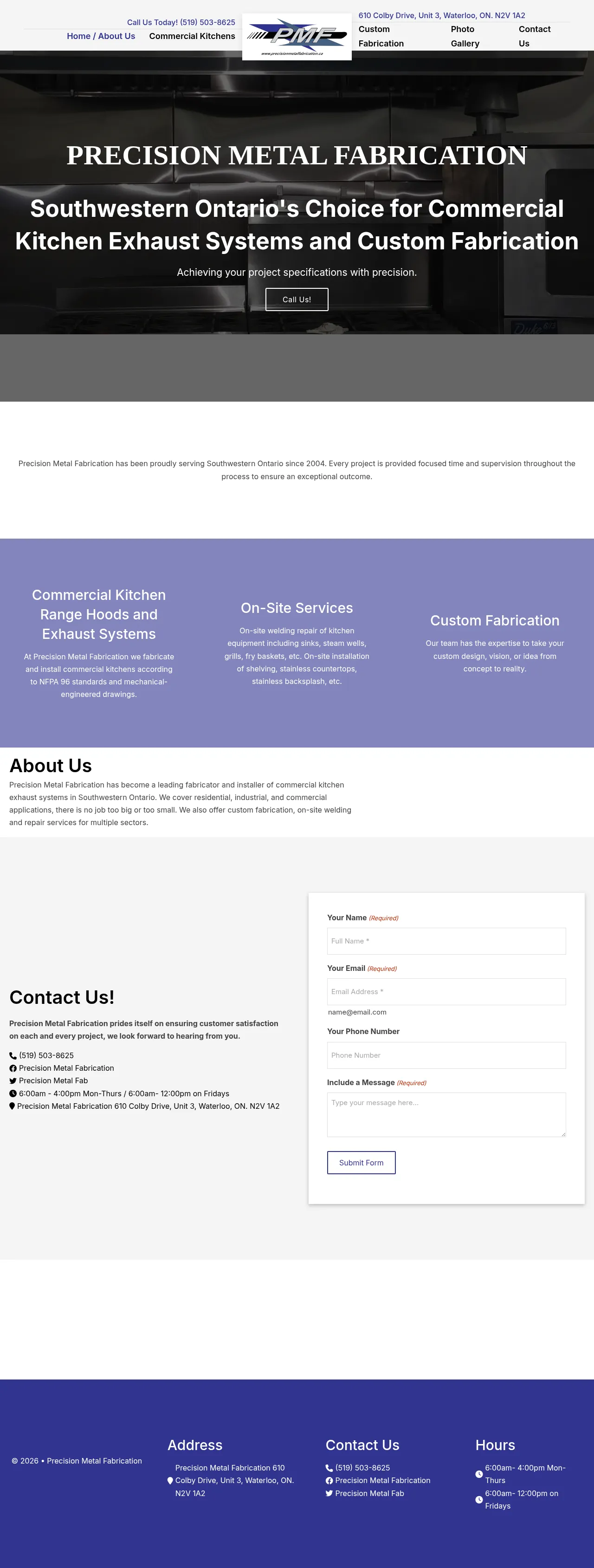Precision Metal Fabrication is a specialized manufacturer and installer serving the residential, commercial, and industrial sectors of Southwestern Ontario since 2004. The company focuses on the custom fabrication and installation of commercial kitchen exhaust systems, adhering strictly to NFPA 96 standards and mechanical engineering specifications. In addition to system installations, they provide on-site welding and repair services for kitchen equipment such as sinks, steam wells, and grills. Their professional offerings also extend to the installation of stainless steel countertops, shelving, and backsplashes. Every project receives dedicated supervision to maintain high standards of quality and operational precision.