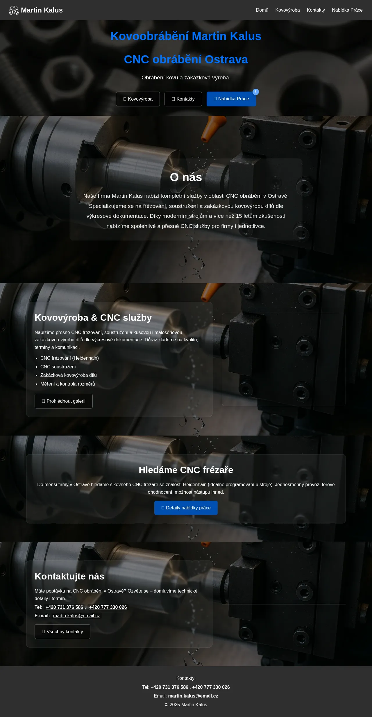 Martin Kalus is an Ostrava-based manufacturing company specializing in precision CNC machining services. With over 15 years of industry experience, the business provides custom milling, turning, and metal fabrication services for both corporate and private clients. The facility handles both single-piece production and small-batch runs based on custom technical documentation. Quality control and timely delivery are central to their operational workflow. The company operates as a dedicated service provider for high-accuracy metal component manufacturing.