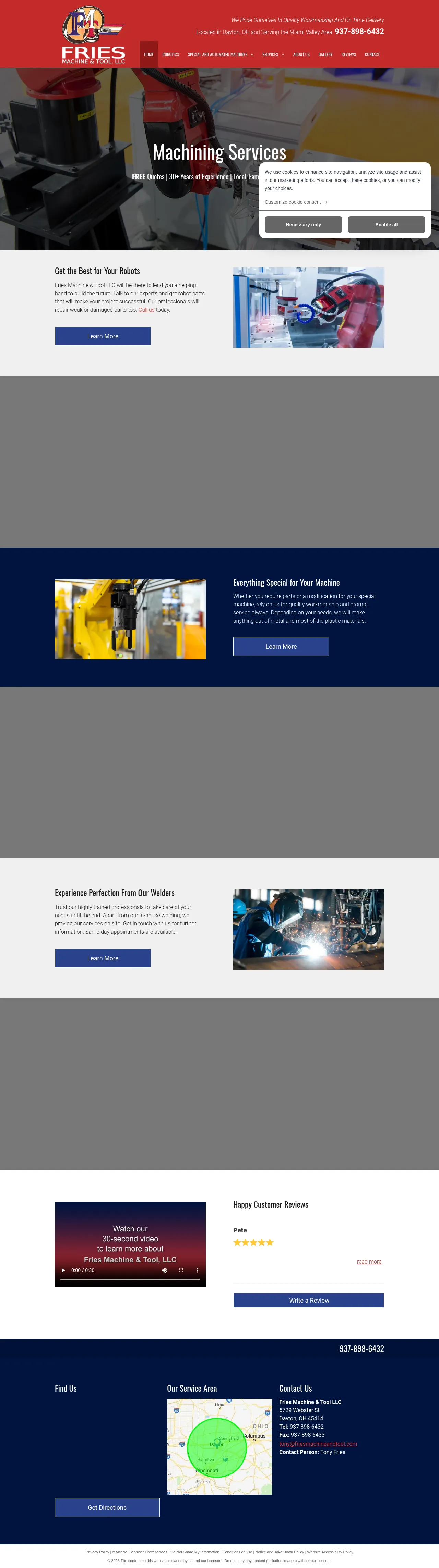 Fries Machine and Tool is a family-owned manufacturing company based in Dayton, Ohio, with over 30 years of experience in the industry. The firm specializes in precision machining, custom automated machinery, robotics integration, and industrial fabrication. Their capabilities include both manual and automated milling, turning, and in-house or on-site welding services. They serve a broad range of sectors, providing design modifications and rapid production for specialized parts. The company is committed to quality workmanship, strict deadline adherence, and collaborative project management from inception to delivery.