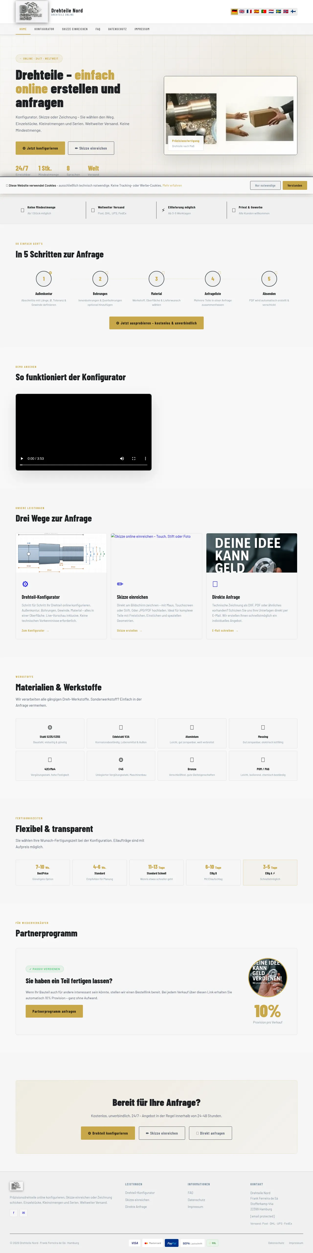 Drehteile Nord supplies precision turned components through an online ordering platform. The company produces single pieces, small batches and serial production runs using CNC turning processes. Orders can be placed via an online configurator or by submitting sketches/drawings; worldwide shipping and express delivery options are available.